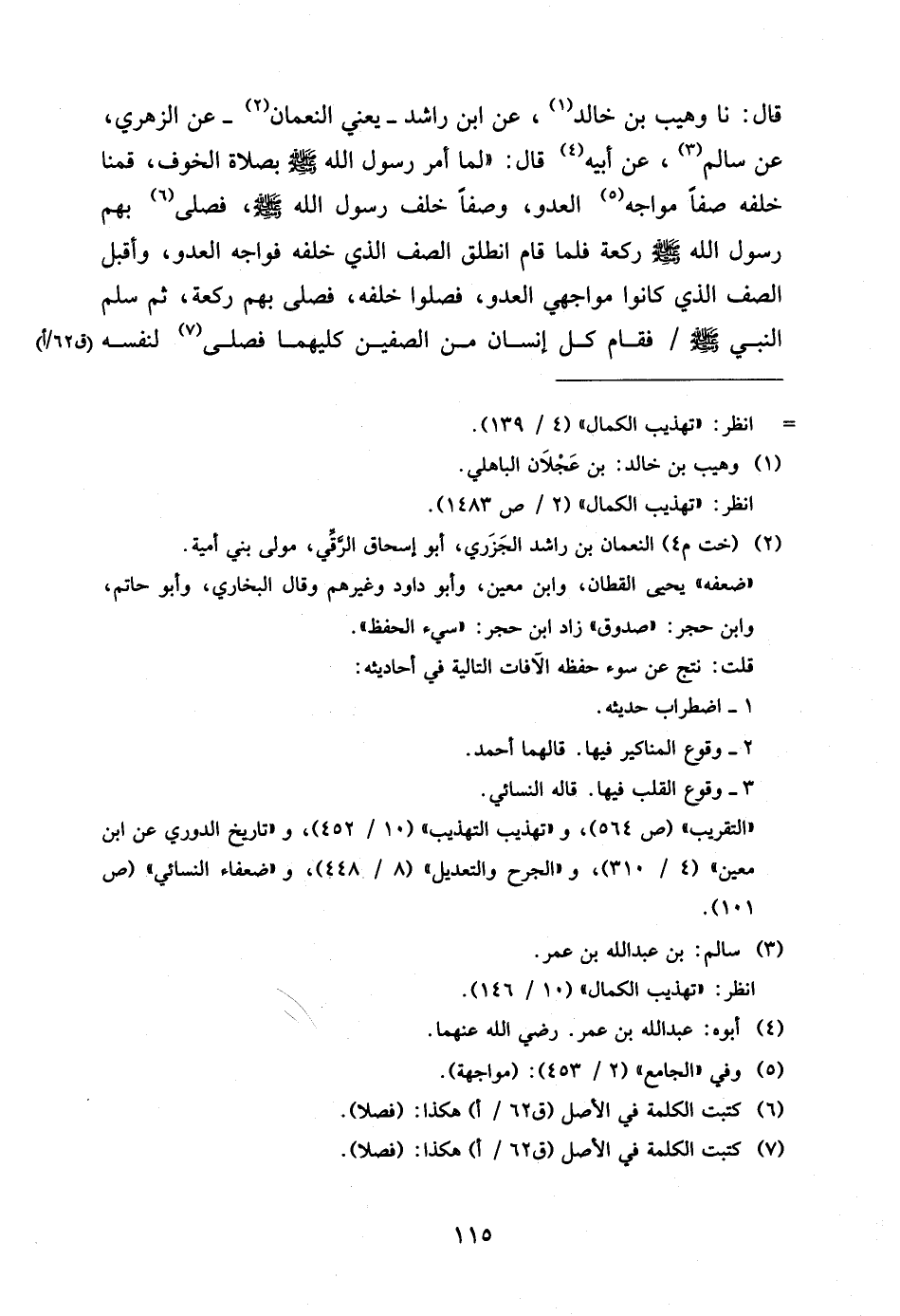 قَالَ نَا وُهَيْبُ بْنُ خَالِدٍ عَنِ ابْنِ رَاشِدٍ يَعْنِي النُّعْمَانَ عَنِ الزُّهْرِيِّ عَنْ سَالِمٍ عَنْ أَبِيهِ قَالَ لَمَّا أَمَرَ رَسُولُ اللَّهِ صَلَّى اللَّهُ عَلَيْهِ وَسَلَّمَ بِصَلاةِ الْخَوْفِ قُمْنَا خَلْفَهُ صَفًّا مُوَاجِهَ الْعَدُوِّ وَصَفًّا خَلْفَ رَسُولِ اللَّهِ صَلَّى اللَّهُ عَلَيْهِ وَسَلَّمَ فَصَلَّى بِهِمْ رَسُولُ اللَّهِ صَلَّى اللَّهُ عَلَيْهِ وَسَلَّمَ رَكْعَةً فَلَمَّا قَامَ انْطَلَقَ الصَّفُّ الَّذِي خَلْفَهُ فَوَاجَهَ الْعَدُوَّ وَأَقْبَلَ الصَّفُّ الَّذِي كَانُوا مُوَاجِهِي الْعَدُوَّ فَصَلُّوا خَلْفَهُ فَصَلَّى بِهِمْ رَكْعَةً ثُمَّ سَلَّمَ النَّبِيُّ صَلَّى اللَّهُ عَلَيْهِ وَسَلَّمَ فَقَامَ كُلُّ إِنْسَانٍ مِنَ الصَّفَّيْنِ كِلَيْهِمَا فَصَلَّى لِنَفْسِهِ