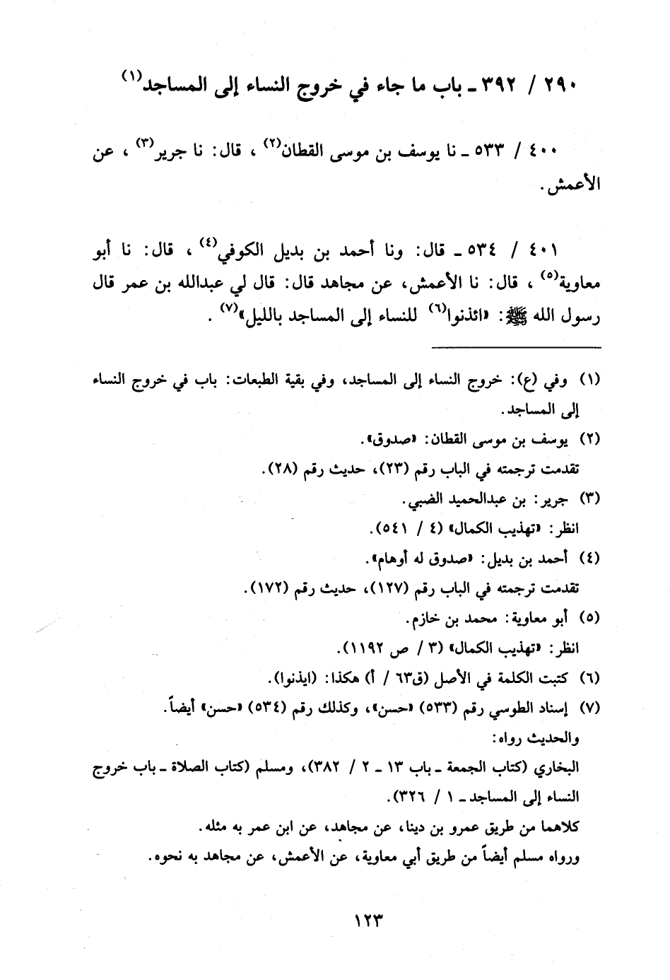401 - / 534 قَالَ ونا أَحْمَدُ بْنُ بُدَيْلٍ الْكُوفِيُّ قَالَ نَا أَبُو مُعَاوِيَةَ قَالَ نَا الأَعْمَشُ عَنْ مُجَاهِدٍ قَالَ قَالَ لِي عَبْدُ اللَّهِ بْنُ عُمَرَ قَالَ رَسُولُ اللَّهِ صَلَّى اللَّهُ عَلَيْهِ وَسَلَّمَ ائْذَنُوا لِلنِّسَاءِ إِلَى الْمَسَاجِدِ بِاللَّيْلِ