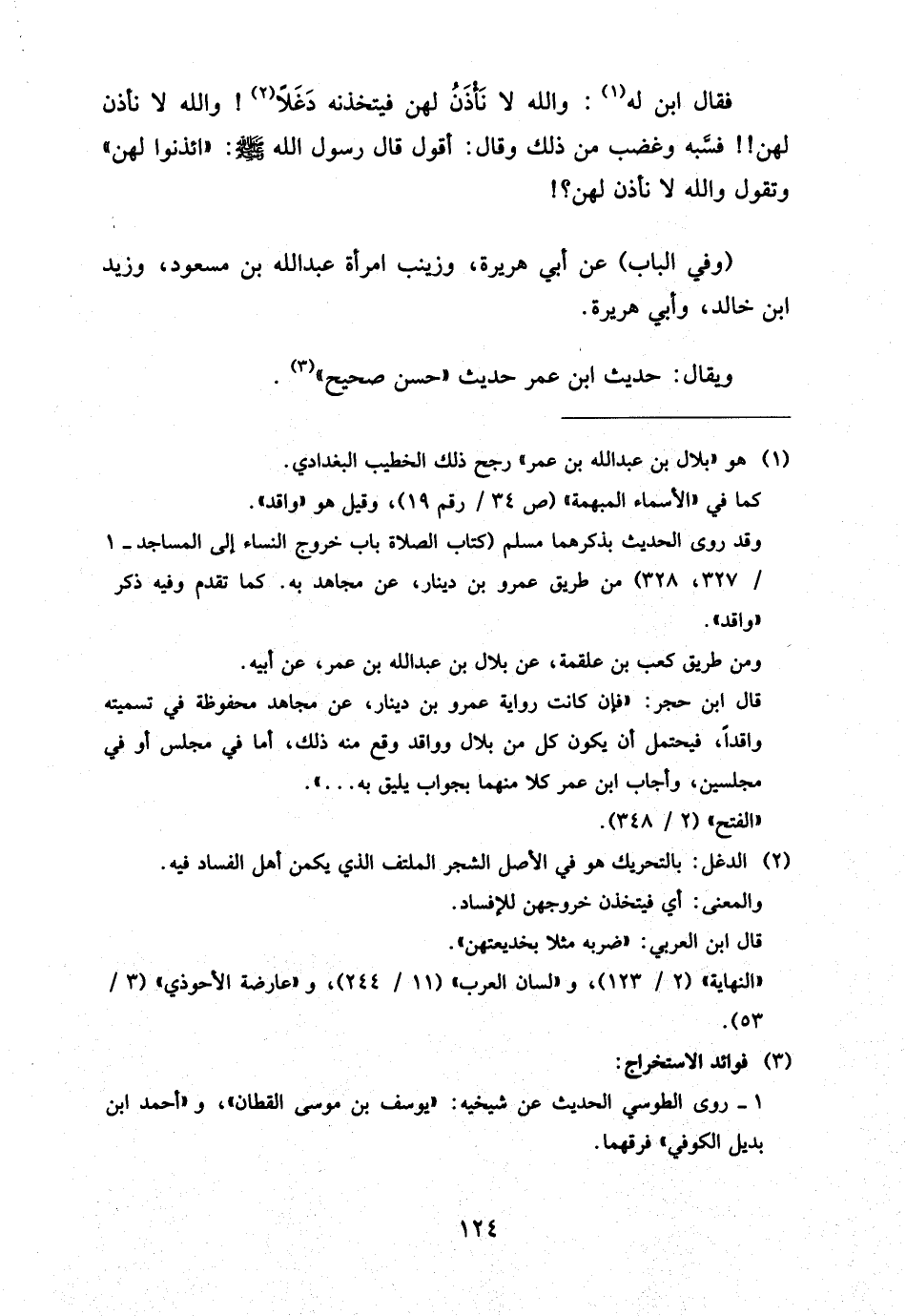 فَقَالَ ابْنٌ لَهُ وَاللَّهِ لَا نَأْذَنُ لَهُنَّ فَيَتَّخِذَنَّهُ دَغَلًا وَاللَّهِ لَا نَأْذَنُ لَهُنَّ فَسَبَّهُ وَغَضِبَ مِنْ ذَلِكَ وَقَالَ أَقُولُ قَالَ رَسُولُ اللَّهِ صَلَّى اللَّهُ عَلَيْهِ وَسَلَّمَ ائْذَنُوا لَهُنَّ وَتَقُولُ وَاللَّهِ لَا نَأْذَنُ لَهُنَّ