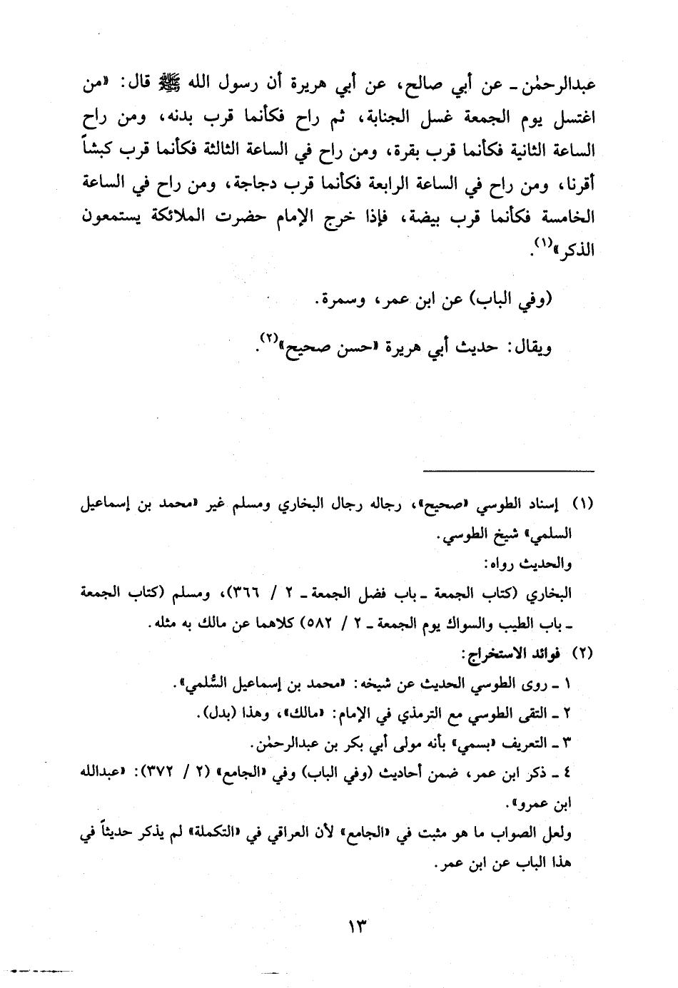 عَبْدِ الرَّحْمَنِ عَنْ أَبِي صَالِحٍ عَنْ أَبِي هُرَيْرَةَ أَنَّ رَسُولَ اللَّهِ صَلَّى اللَّهُ عَلَيْهِ وَسَلَّمَ قَالَ مَنِ اغْتَسَلَ يَوْمَ الْجُمُعَةِ غُسْلَ الْجَنَابَةِ ثُمَّ رَاحَ فَكَأَنَّمَا قَرَّبَ بَدَنَةً وَمَنْ رَاحَ السَّاعَةَ الثَّانِيَةَ فَكَأَنَّمَا قَرَّبَ بَقَرَةً وَمَنْ رَاحَ فِي السَّاعَةِ الثَّالِثَةِ فَكَأَنَّمَا قَرَّبَ كَبْشًا أقرنا وَمَنْ رَاحَ فِي السَّاعَةِ الرَّابِعَةِ فَكَأَنَّمَا قَرَّبَ دَجَاجَةً وَمَنْ رَاحَ فِي السَّاعَةِ الْخَامِسَةِ فَكَأَنَّمَا قَرَّبَ بَيْضَةً فَإِذَا خَرَجَ الإِمَامُ حَضَرَتِ الْمَلائِكَةُ يَسْتَمِعُونَ الذِّكْرَ