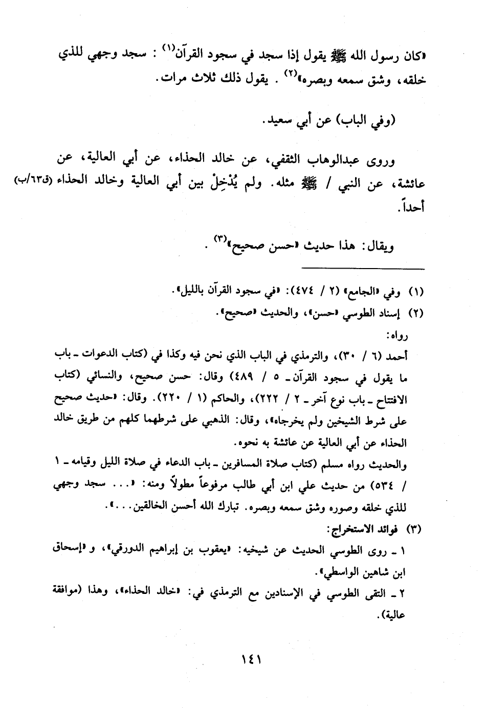 كَانَ رَسُولُ اللَّهِ صَلَّى اللَّهُ عَلَيْهِ وَسَلَّمَ يَقُولُ إِذَا سَجَدَ فِي سُجُودِ الْقُرْآنِ سَجَدَ وَجْهِي لِلَّذِي خَلَقَهُ وَشَقَّ سَمْعَهُ وَبَصَرَهُ يَقُولُ ذَلِكَ ثَلاثَ مَرَّاتٍ