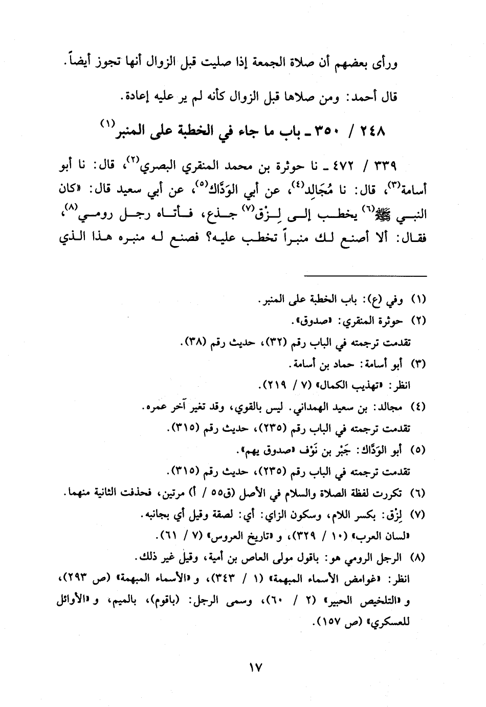 339 - / 472 نَا حَوْثَرَةُ بْنُ مُحَمَّدٍ الْمِنْقَرِيُّ الْبَصْرِيّ قَالَ نَا أَبُو أُسَامَة قالنا مُجَالِدٌ عَنْ أَبِي الْوَدَّاكِ عَنْ أَبِي سَعِيدٍ قَالَ كَانَ النَّبِيُّ صَلَّى اللَّهُ عَلَيْهِ وَسَلَّمَ يَخْطُبُ إِلَى لِزْقِ جِذْعٍ فَأَتَاهُ رَجُلٌ رُومِيٌّ فَقَالَ أَلا أَصْنَعُ لَكَ مِنْبَرًا تَخْطُبُ عَلَيْهِ فَصَنَعَ لَهُ مِنْبَرَهُ هَذَا الَّذِي