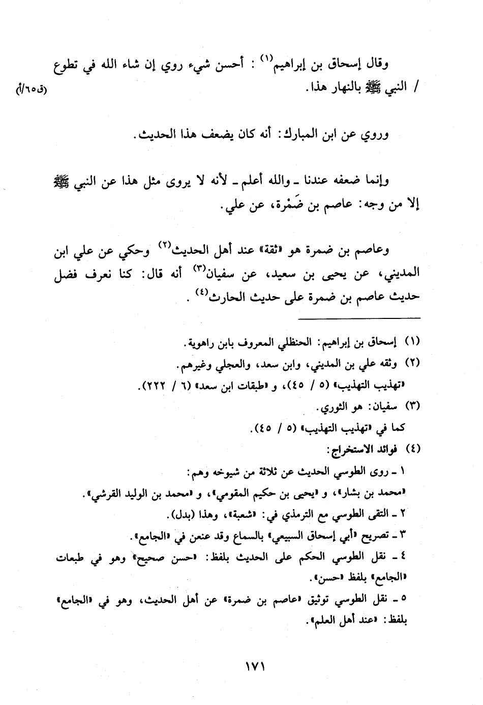وَعَاصِمُ بْنُ ضَمْرَةَ هُوَ ثِقَةٌ عِنْدَ أَهْلِ الْحَدِيثِ وَحُكِيَ عَنْ عَلِيِّ ابْن الْمَدِينِيِّ عَنْ يَحْيَى بْنِ سَعِيدٍ عَنْ سُفْيَانَ أَنَّهُ قَالَ كُنَّا نَعْرِفُ فَضْلَ حَدِيثِ عَاصِمِ بْنِ ضَمْرَةَ عَلَى حَدِيثِ الْحَارِثِ