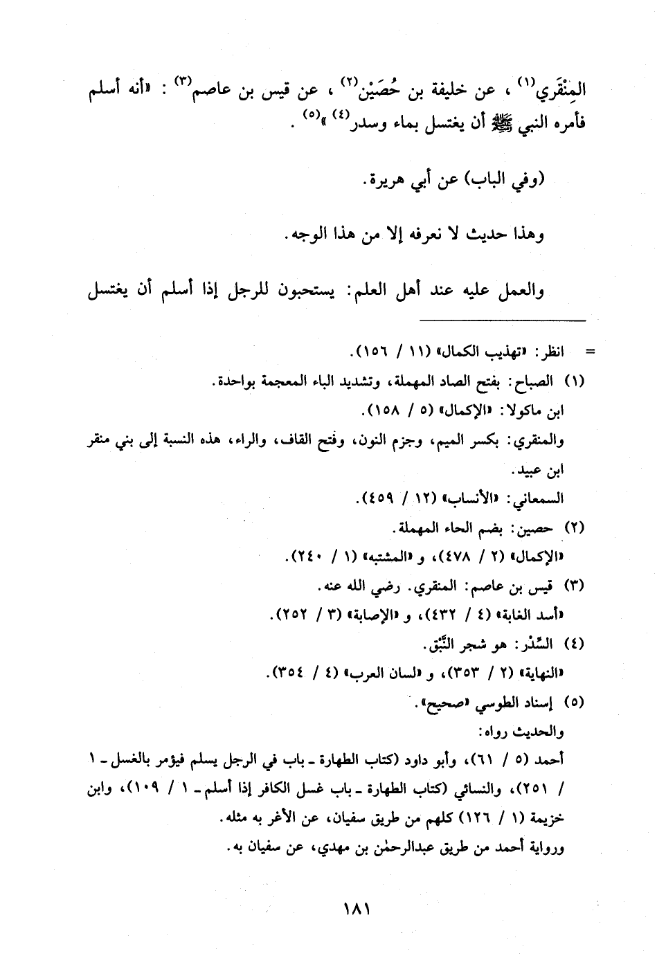 الْمِنْقَرِيُّ عَنْ خَلِيفَةَ بْنِ حُصَيْنٍ عَنْ قَيْسِ بْنِ عَاصِمٍ أَنَّهُ أَسْلَمَ فَأَمَرَهُ النَّبِيُّ صَلَّى اللَّهُ عَلَيْهِ وَسَلَّمَ أَنْ يَغْتَسِلَ بِمَاءٍ وَسِدْرٍ