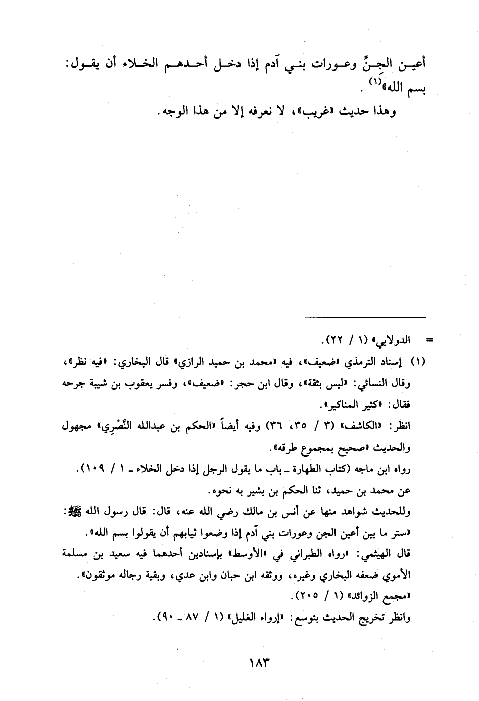 أَعْيُنِ الْجِنِّ وَعَوْرَاتِ بَنِي آدَمَ إِذَا دَخَلَ أَحَدُهُمُ الْخَلاءَ أَنْ يَقُولَ بِسْمِ اللَّهِ