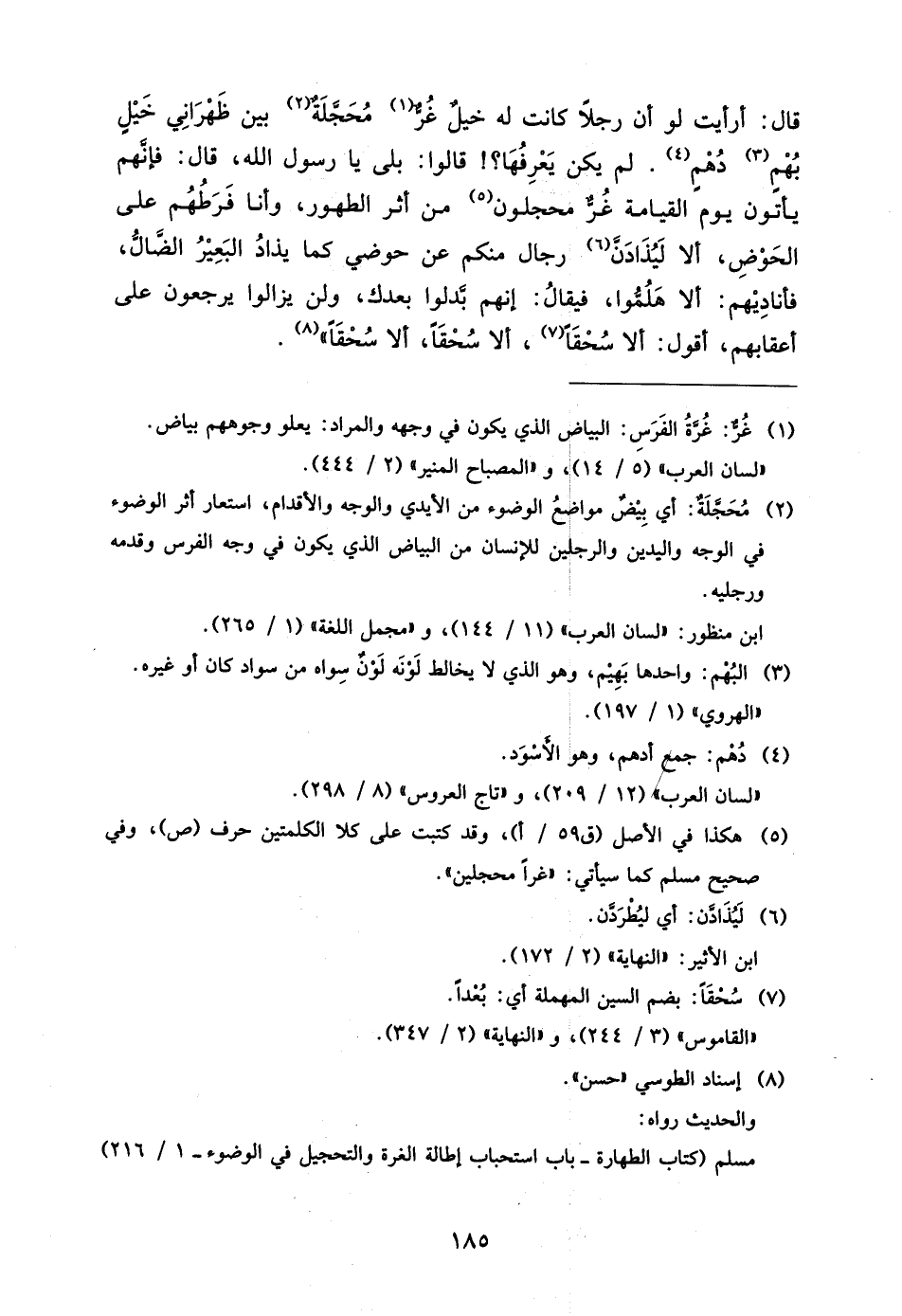 قَالَ أَرَأَيْتَ لَوْ أَنْ رَجُلًا كَانَتْ لَهُ خيل غر محجلة بن ظَهْرَانَيْ خَيْلٍ بُهْمٍ دُهْمٍ لَمْ يَكُنْ يَعْرِفُهَا قَالُوا بَلَى يَا رَسُولَ اللَّهِ قَالَ فَإِنَّهُمْ يَأْتُونَ يَوْمَ الْقِيَامَةِ غُرٌّ مُحَجَّلُونَ مِنْ أَثَرِ الطُّهُورِ وَأَنَا فَرَطُهُمْ عَلَى الْحَوْضِ أَلا لَيُذَادَنَّ رِجَالٌ مِنْكُمْ عَنْ حَوْضِي كَمَا يُذَادُ الْبَعِيرُ الضَّالُّ فَأُنَادِيهِمْ أَلا هَلُمُّوا فَيُقَالُ إِنَّهُمْ بَدَّلُوا بَعْدَكَ وَلَنْ يَزَالُوا يَرْجِعُونَ عَلَى أَعْقَابِهِمْ أَقُولُ أَلا سُحْقًا أَلا سُحْقًا أَلا سُحْقًا