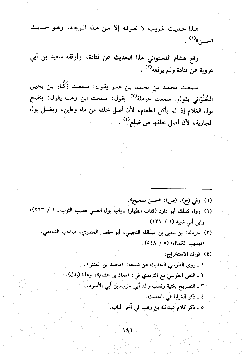 سَمِعْتُ مُحَمَّدَ بْنَ مُحَمَّدِ بْنِ عُمَرَ يَقُولُ سَمِعْتُ زَكَّارَ بْنَ يَحْيَى الْحُلْوَانِيَّ يَقُولُ سَمِعْتُ حَرْمَلَةَ يَقُولُ سَمِعْتُ ابْنَ وَهْبٍ يَقُولُ يُنْضَحُ بَوْلُ الْغُلامِ إِذَا لَمْ يَأْكُلِ الطَّعَامَ لأَنَّ أَصْلَ خَلْقِهِ مِنْ مَاءٍ وَطِينٍ وَيُغْسَلُ بَوْلُ الْجَارِيَةِ لأَنَّ أَصْلَ خَلْقِهَا مِنْ ضِلْعٍ