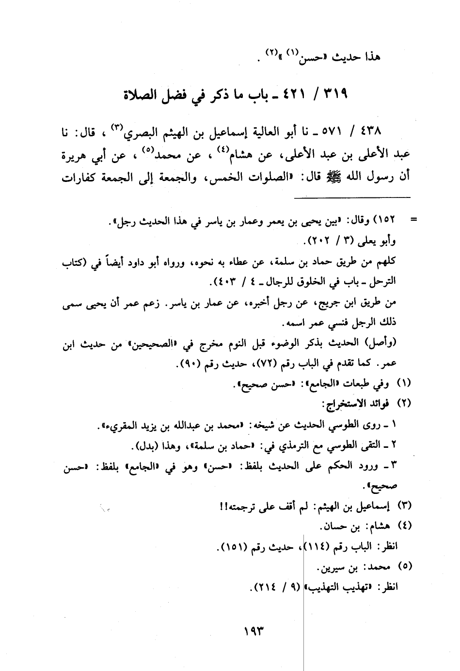 438 - / 571 نَا أَبُو الْعَالِيَةِ إِسْمَاعِيلُ بْنُ الْهَيْثَمِ الْبَصْرِيُّ قَالَ نَا عَبْدُ الأَعْلَى بْنُ عَبْدِ الأَعْلَى عَنْ هِشَامٍ عَنْ مُحَمَّدٍ عَنْ أَبِي هُرَيْرَةَ أَنَّ رَسُولَ اللَّهِ صَلَّى اللَّهُ عَلَيْهِ وَسَلَّمَ قَالَ الصَّلَوَاتُ الْخَمْسُ وَالْجُمُعَةُ إِلَى الْجُمُعَة كَفَّارَات