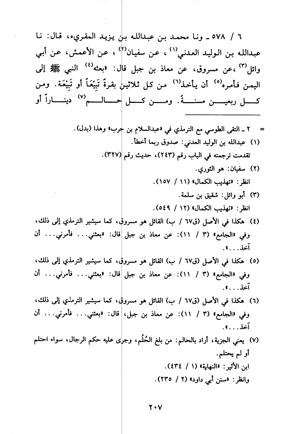 6 - / 586 وَنا مُحَمَّدُ بْنُ عَبْدِ اللَّهِ بْنِ يَزِيدَ المقريء قَالَ نَا عَبْدُ اللَّهِ بْنُ الْوَلِيدِ الْعَدَنِيُّ عَنْ سُفْيَانَ عَنِ الأَعْمَشِ عَنْ أَبِي وَائِلٍ عَنْ مَسْرُوقٍ عَنْ مُعَاذِ بْنِ جَبَلٍ قَالَ بَعَثَهُ النَّبِيُّ صَلَّى اللَّهُ عَلَيْهِ وَسَلَّمَ إِلَى الْيَمَنِ فَأَمَرَهُ أَنْ يَأْخُذَ مِنْ كُلِّ ثَلاثِينَ بقرة تبيعا أَو تبيعة وَمن كل ربعين مُسِنَّةً وَمِنْ كُلِّ حَالِمٍ دِينَارًا أَوْ