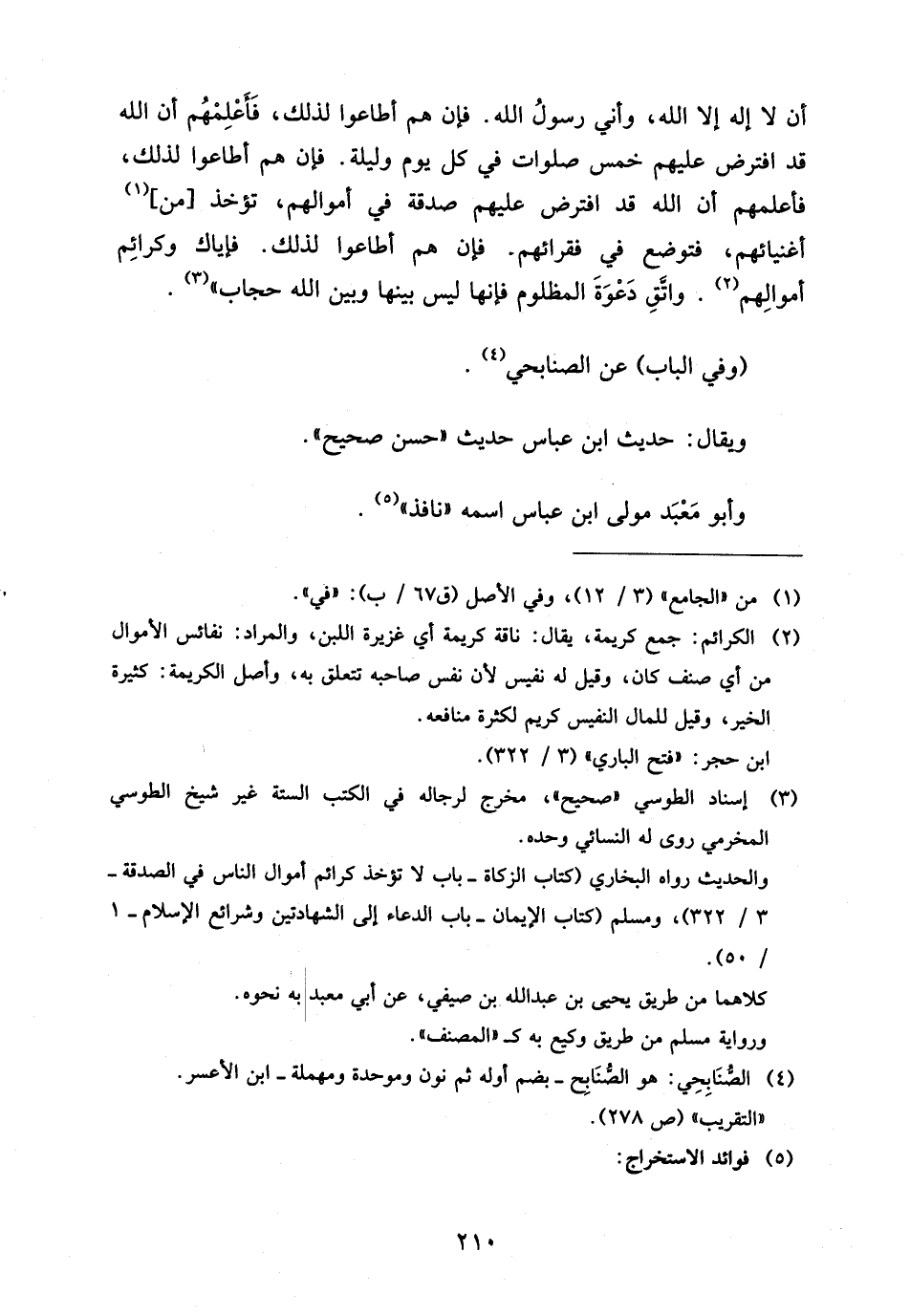 أَنْ لَا إِلَهَ إِلا اللَّهُ وَأَنِّي رَسُولُ اللَّهِ فَإِنْ هُمْ أَطَاعُوا لِذَلِكَ فَأَعْلِمْهُمْ أَنَّ اللَّهَ قَدِ افْتَرَضَ عَلَيْهِمْ خَمْسَ صَلَوَاتٍ فِي كُلِّ يَوْمٍ وَلَيْلَةٍ فَإِنْ هُمْ أَطَاعُوا لِذَلِكَ فَأَعْلِمْهُمْ أَنَّ اللَّهَ قَدِ افْتَرَضَ عَلَيْهِمْ صَدَقَةً فِي أَمْوَالِهِمْ تُؤْخَذُ مِنْ أَغْنِيَائِهِمْ فَتُوضَعُ فِي فُقَرَائِهِمْ فَإِنْ هُمْ أَطَاعُوا لِذَلِكَ فَإِيَّاكَ وَكَرَائِمَ أَمْوَالِهِمْ وَاتَّقِ دَعْوَةَ الْمَظْلُومِ فَإِنَّهَا لَيْسَ بَيْنَهَا وَبَيْنَ اللَّهِ حِجَابٌ