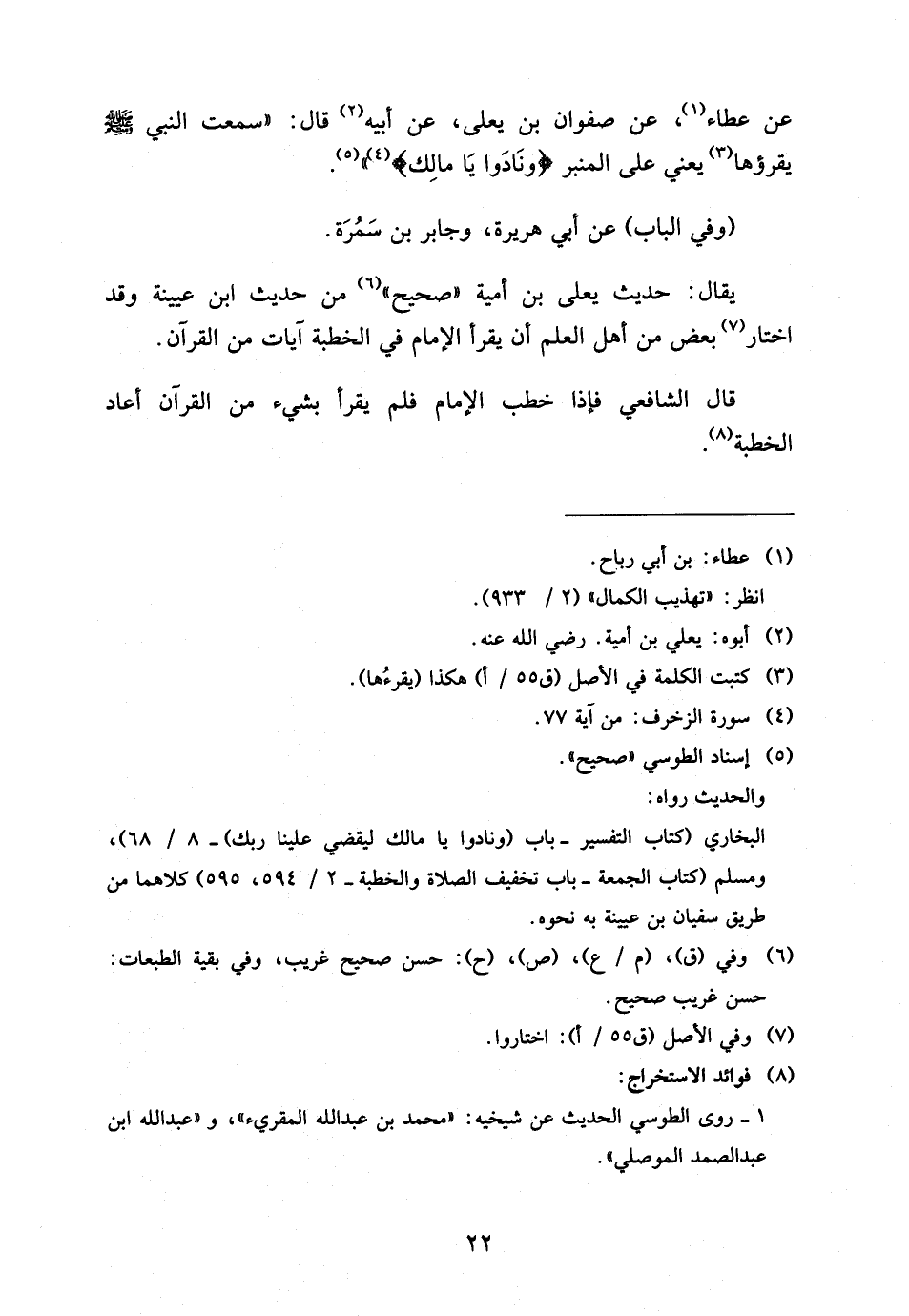 يُقَالُ حَدِيثُ يَعْلَى بْنِ أُمَيَّةَ صَحِيحٌ مِنْ حَدِيثِ ابْنِ عُيَيْنَةَ وَقَدِ اخْتَارَ بَعْضٌ مِنْ أَهْلِ الْعِلْمِ أَنْ يَقْرَأَ الإِمَامُ فِي الْخُطْبَةِ آيَاتٌ مِنَ الْقُرْآنِ