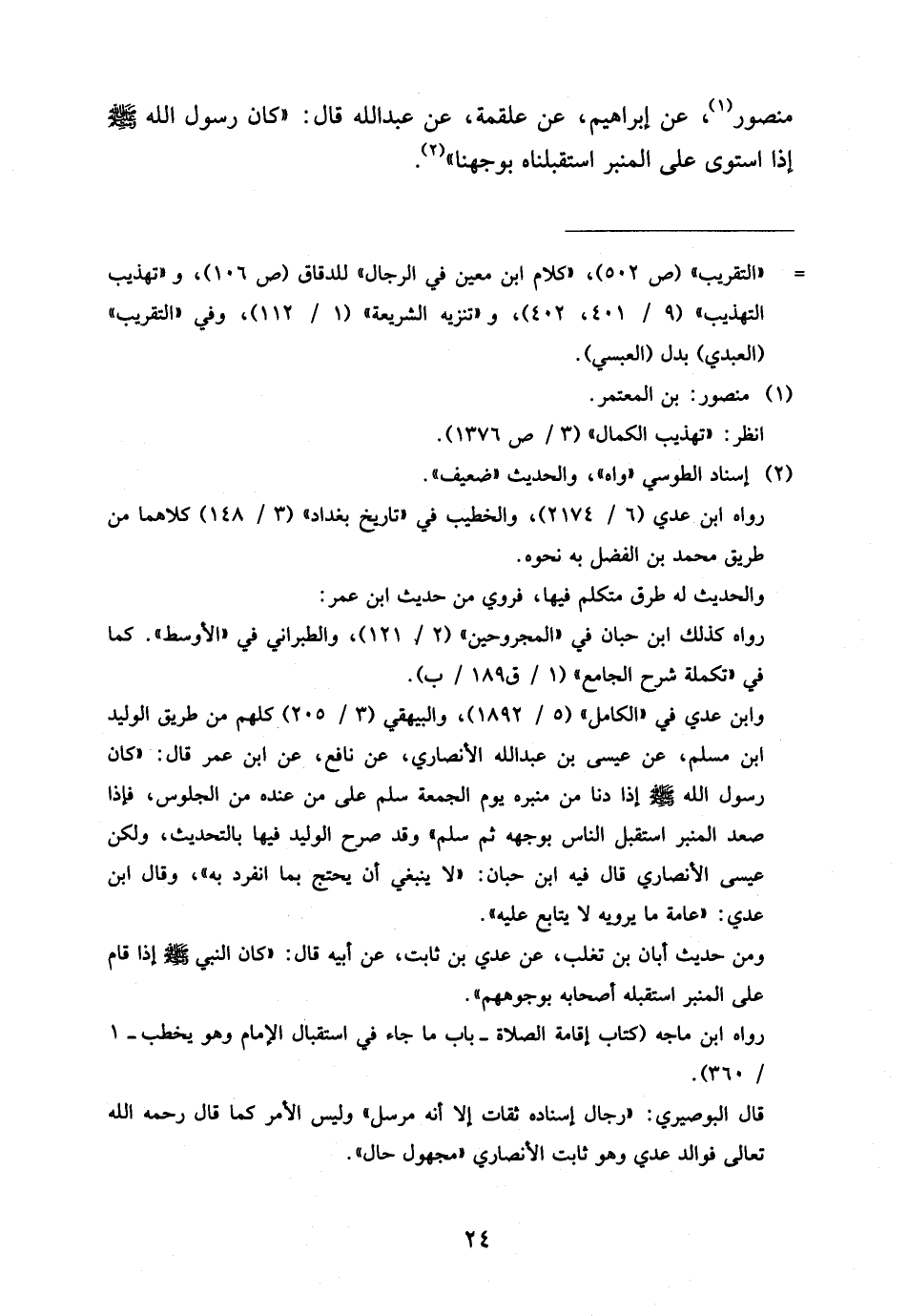 مَنْصُورٍ عَنْ إِبْرَاهِيمَ عَنْ عَلْقَمَةَ عَنْ عَبْدِ اللَّهِ قَالَ كَانَ رَسُولُ اللَّهِ صَلَّى اللَّهُ عَلَيْهِ وَسَلَّمَ إِذَا اسْتَوَى عَلَى الْمِنْبَرِ اسْتَقْبَلْنَاهُ بوجهنا