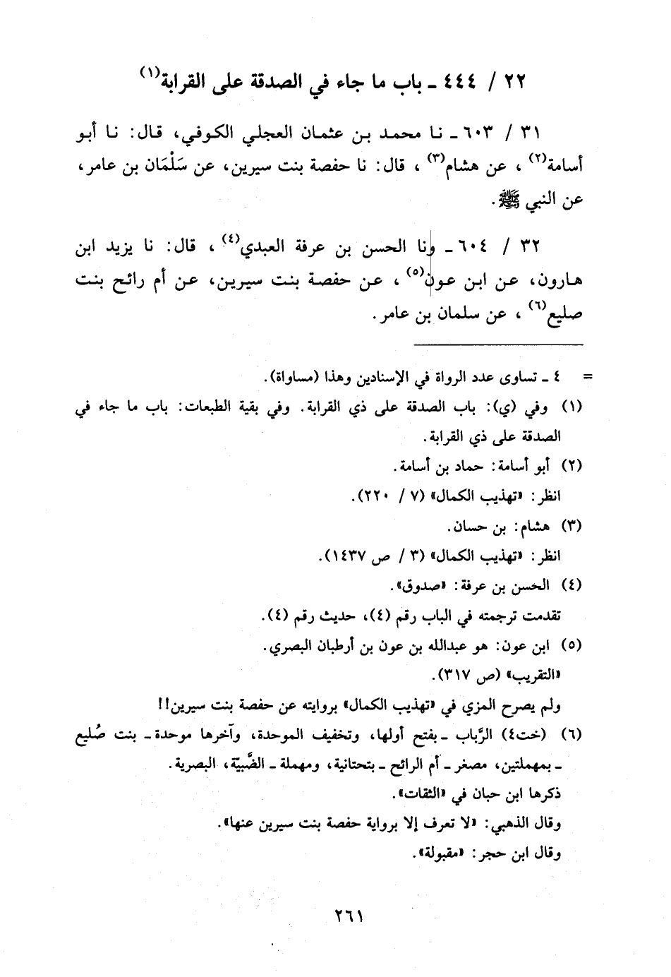 32 - / 604 ونا الْحَسَنُ بْنُ عَرَفَةَ الْعَبْدِيُّ قَالَ نَا يَزِيدُ ابْن هَارُونَ عَنِ ابْنِ عَوْنٍ عَنْ حَفْصَةَ بِنْتِ سِيرِينَ عَنْ أُمِّ رَائِحٍ بِنْتِ صُلَيْعٍ عَنْ سَلْمَانَ بْنِ عَامِرٍ