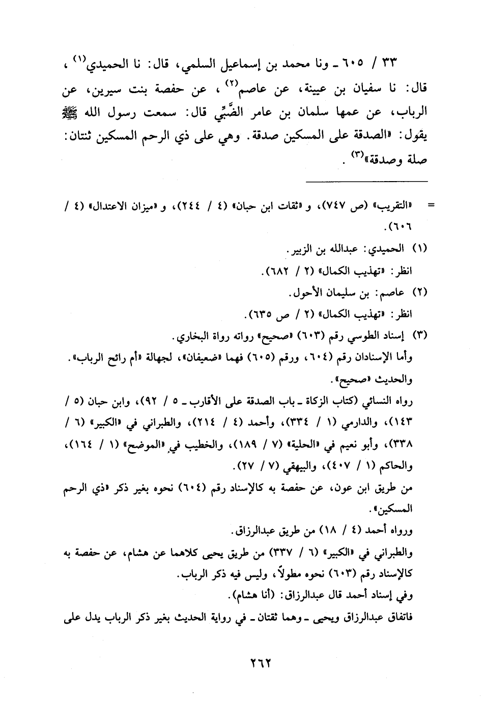 33 - / 605 وَنا مُحَمَّدُ بْنُ إِسْمَاعِيلَ السُّلَمِيُّ قَالَ نَا الْحُمَيْدِيُّ قَالَ نَا سُفْيَانُ بْنُ عُيَيْنَةَ عَنْ عَاصِم عَن حَفْصَة بنت سِرين عَنِ الرَّبَابِ عَنْ عَمِّهَا سَلْمَانَ بْنِ عَامِرٍ الضَّبِّيِّ قَالَ سَمِعْتُ رَسُولَ اللَّهِ صَلَّى اللَّهُ عَلَيْهِ وَسَلَّمَ يَقُولُ الصَّدَقَةُ عَلَى الْمِسْكِينِ صَدَقَةٌ وَهِيَ عَلَى ذِي الرَّحِمِ الْمِسْكِينِ ثِنْتَانِ صِلَةٌ وَصدقَة