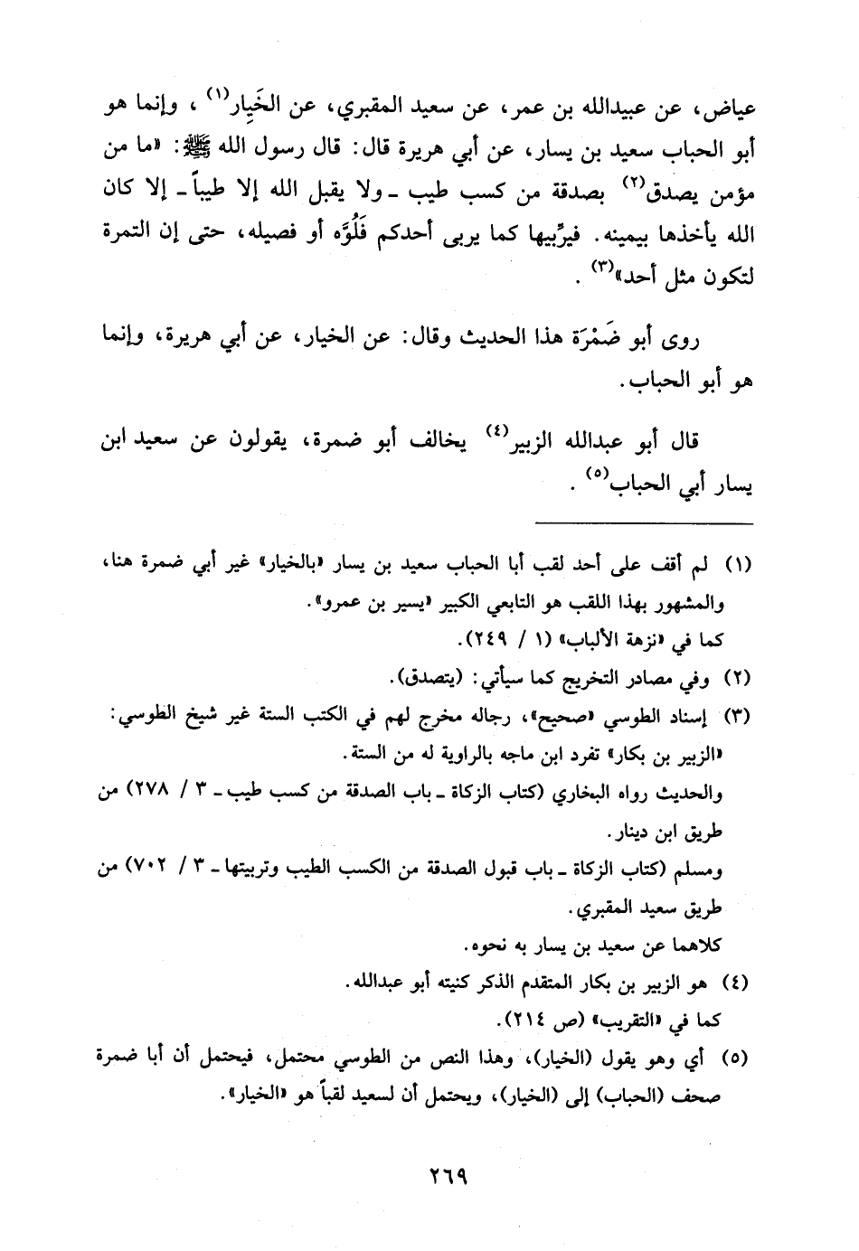 عِيَاض عَن عبيد الله بْنِ عُمَرَ عَنْ سَعِيدٍ الْمَقْبُرِيِّ عَنِ الْخِيَارِ وَإِنَّمَا هُوَ أَبُو الْحُبَابِ سَعِيدُ بْنُ يَسَارٍ عَنْ أَبِي هُرَيْرَةَ قَالَ قَالَ رَسُولُ اللَّهِ صَلَّى اللَّهُ عَلَيْهِ وَسَلَّمَ مَا مِنْ مُؤْمِنٍ يَصَّدَّقُ بِصَدَقَةٍ مِنْ كَسْبٍ طَيِّبٍ وَلا يَقْبَلُ اللَّهُ إِلا طَيِّبًا إِلا كَانَ اللَّهُ يَأْخُذُهَا بِيَمِينِهِ فَيُرَبِّيهَا كَمَا يُرَبِّي أَحَدُكُمْ فَلُوَّهُ أَوْ فَصِيلَهُ حَتَّى إِنَّ التَّمْرَةَ لَتَكُونُ مِثْلَ أُحُدٍ