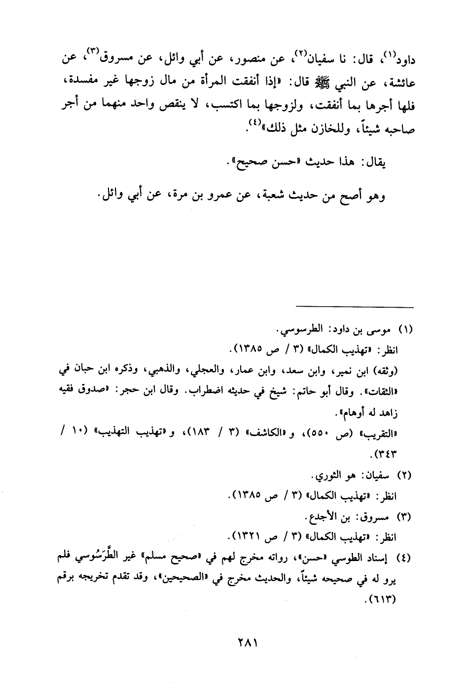دَاوُدَ قَالَ نَا سُفْيَانُ عَنْ مَنْصُورٍ عَنْ أَبِي وَائِلٍ عَنْ مَسْرُوقٍ عَنْ عَائِشَةَ عَنِ النَّبِيَّ صَلَّى اللَّهُ عَلَيْهِ وَسَلَّمَ قَالَ إِذَا أَنْفَقَتِ الْمَرْأَةُ مِنْ مَالِ زَوْجِهَا غَيْرَ مُفْسِدَةٍ فَلَهَا أَجْرُهَا بِمَا أَنْفَقَتْ وَلِزَوْجِهَا بِمَا اكْتَسَبَ لَا يَنْقُصُ وَاحِدٌ مِنْهُمَا مِنْ أَجْرِ صَاحِبِهِ شَيْئًا وَلِلْخَازِنِ مِثْلُ ذَلِكَ