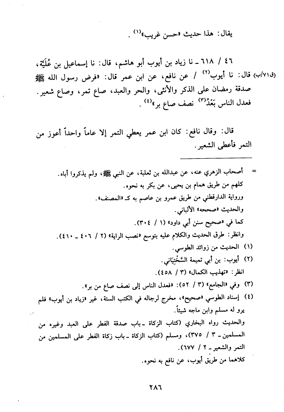 46 - / 618 نَا زِيَادُ بْنُ أَيُّوبَ أَبُو هَاشِمٍ قَالَ نَا إِسْمَاعِيلُ بن علبة قَالَ نَا أَيُّوبُ عَنْ نَافِعٍ عَنِ ابْنِ عُمَرَ قَالَ فَرَضَ رَسُولُ اللَّهِ صَلَّى اللَّهُ عَلَيْهِ وَسَلَّمَ صَدَقَةَ رَمَضَانَ عَلَى الذَّكَرِ وَالأُنْثَى وَالْحُرِّ وَالْعَبْدِ صَاعَ تَمْرٍ وَصَاعَ شَعِيرٍ فَعَدَلَ النَّاسُ بَعْدُ نِصْفَ صَاعٍ بُرٍّ