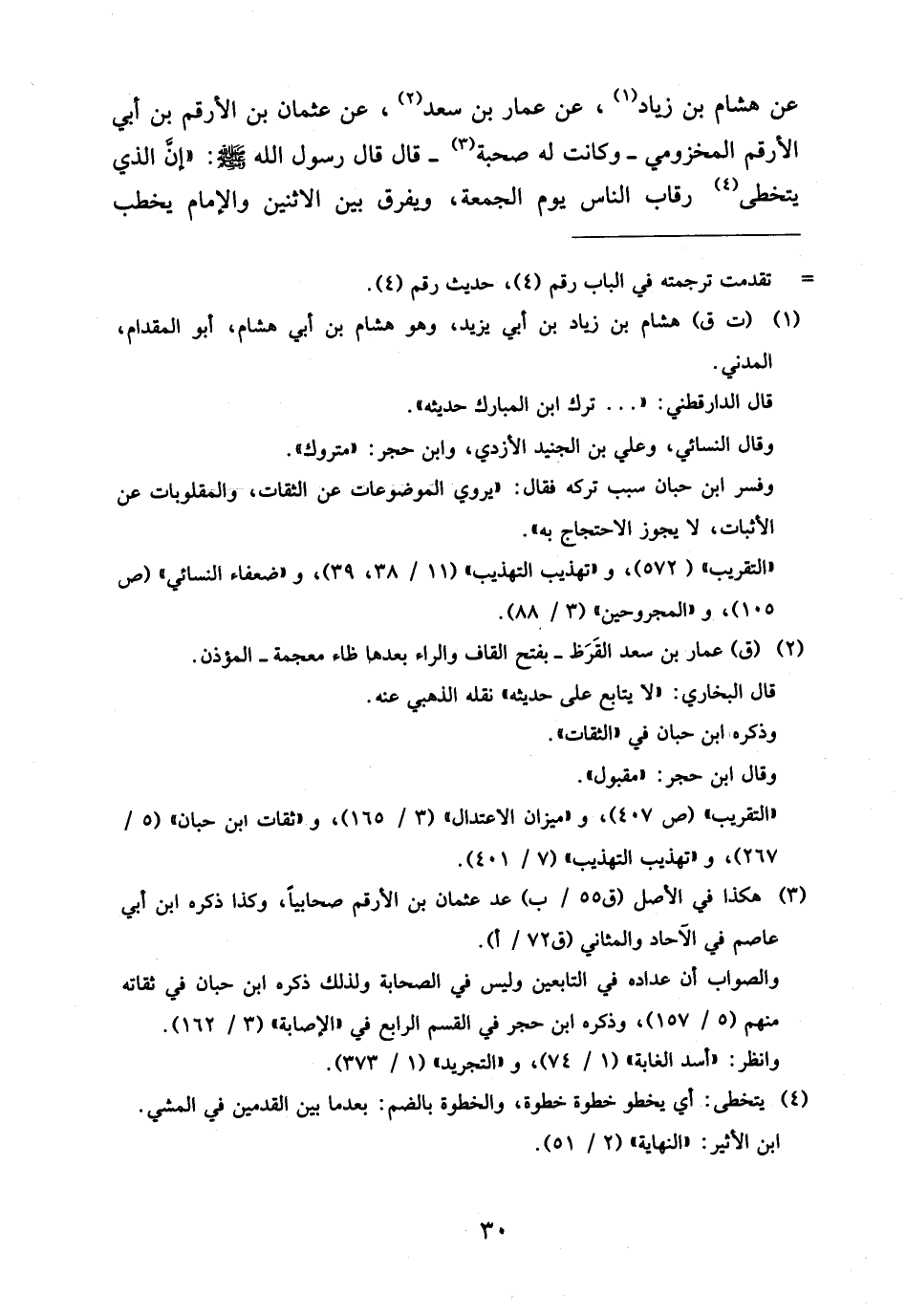عَنْ هِشَامِ بْنِ زِيَادٍ عَنْ عَمَّارِ بْنِ سعد عَن عُثْمَان بن الأرقم بْنِ أَبِي الأَرْقَمِ الْمَخْزُومِيِّ وَكَانَتْ لَهُ صُحْبَةٌ قَالَ قَالَ رَسُولُ اللَّهِ صَلَّى اللَّهُ عَلَيْهِ وَسَلَّمَ إِنَّ الَّذِي يَتَخَطَّى رِقَابَ النَّاسِ يَوْمَ الْجُمُعَةِ وَيُفَرِّقُ بَيْنَ الاثْنَيْنِ وَالإِمَامُ يَخْطُبُ