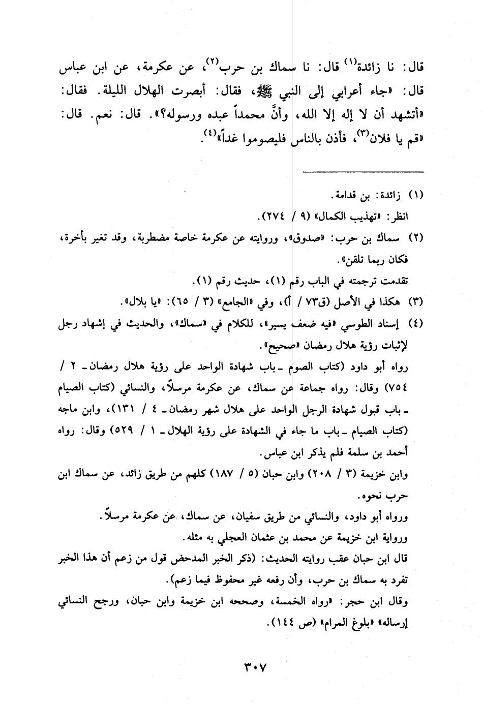 قَالَ نَا زَائِدَةُ قَالَ نَا سِمَاكُ بْنُ حَرْبٍ عَنْ عِكْرِمَةَ عَنِ ابْنِ عَبَّاسٍ قَالَ جَاءَ أَعْرَابِيٌّ إِلَى النَّبِيِّ صَلَّى اللَّهُ عَلَيْهِ وَسَلَّمَ فَقَالَ أَبْصَرْتُ الْهِلالَ اللَّيْلَةَ فَقَالَ أَتَشْهَدُ أَنْ لَا إِلَهَ إِلا اللَّهُ وَأَنَّ مُحَمَّدًا عَبْدُهُ وَرَسُولُهُ قَالَ نَعَمْ قَالَ قُمْ يَا فُلانُ فَأَذِّنْ بِالنَّاسِ فَلْيَصُومُوا غَدًا