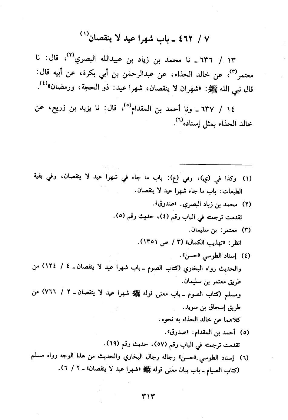 13 - / 636 نَا مُحَمَّدُ بْنُ زِيَادِ بْنِ عُبَيْدِ اللَّهِ الْبَصْرِيُّ قَالَ نَا مُعْتَمِرٌ عَنْ خَالِدٍ الْحَذَّاءِ عَنْ عَبْدِ الرَّحْمَنِ بْنِ أَبِي بَكْرَةَ عَنْ أَبِيهِ قَالَ قَالَ نَبِيُّ اللَّهِ صَلَّى اللَّهُ عَلَيْهِ وَسَلَّمَ شَهْرَانِ لَا يَنْقُصَانِ شَهْرَا عِيدٍ ذُو الْحَجَّةِ وَرَمَضَانُ