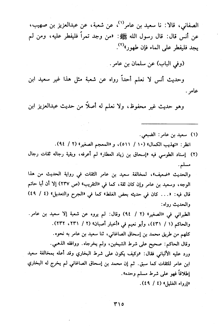 الصَّفَّانِيُّ قَالا نَا سَعِيدُ بْنُ عَامِرٍ عَنْ شُعْبَةَ عَنْ عَبْدِ الْعَزِيزِ بْنِ صُهَيْبٍ عَنْ أَنَسٍ قَالَ قَالَ رَسُولُ اللَّهِ صَلَّى اللَّهُ عَلَيْهِ وَسَلَّمَ مَنْ وَجَدَ تَمْرًا فَلْيُفْطِرْ عَلَيْهِ وَمن لم يجد فليفطر على المَاء فَإِن طَهُورٌ