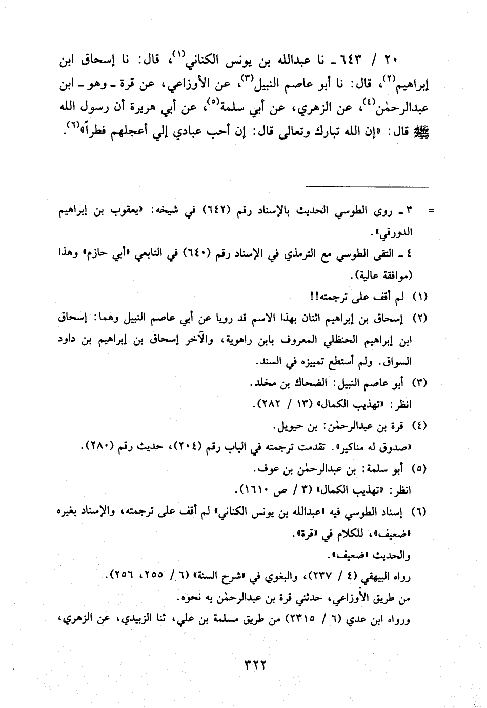 20 - / 643 نَا عَبْدُ اللَّهِ بْنُ يُونُسَ الْكِنَانِيُّ قَالَ نَا إِسْحَاق ابْن إِبْرَاهِيمَ قَالَ نَا أَبُو عَاصِمٍ النَّبِيلُ عَنِ الأَوْزَاعِيِّ عَنْ قُرَّةَ وَهُوَ ابْنُ عَبْدِ الرَّحْمَنِ عَنِ الزُّهْرِيِّ عَنْ أَبِي سَلَمَةَ عَنْ أَبِي هُرَيْرَةَ أَنَّ رَسُولَ اللَّهِ صَلَّى اللَّهُ عَلَيْهِ وَسَلَّمَ قَالَ إِنَّ اللَّهَ تَبَارَكَ وَتَعَالَى قَالَ إِنَّ أَحَبَّ عِبَادِي إِلَيَّ أَعْجَلُهُمْ فِطْرًا