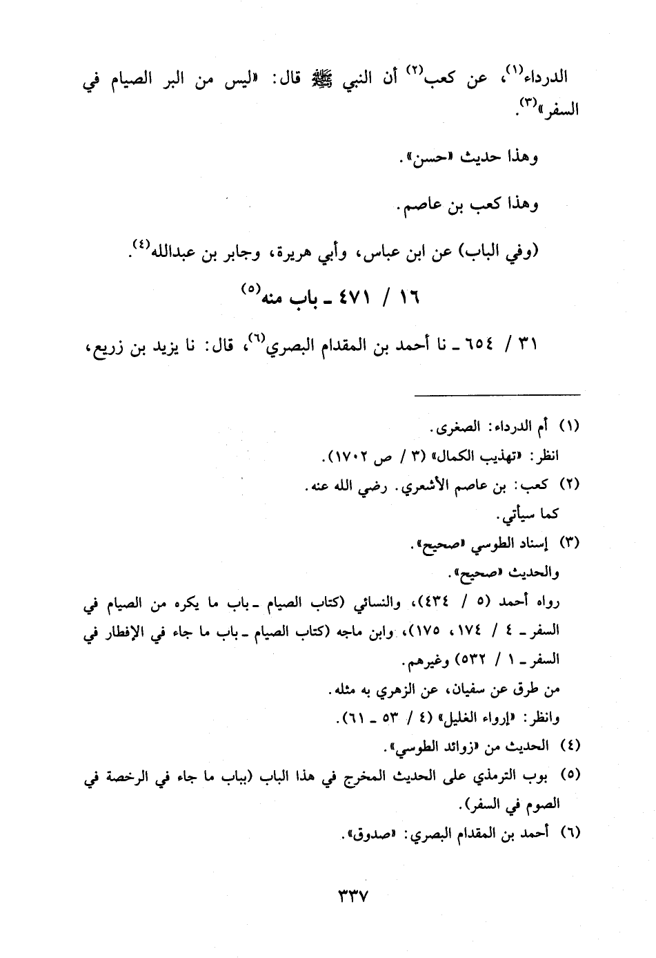 الدَّرْدَاءِ عَنْ كَعْبٍ أَنَّ النَّبِيَّ صَلَّى اللَّهُ عَلَيْهِ وَسَلَّمَ قَالَ لَيْسَ مِنَ الْبِرِّ الصِّيَامُ فِي السَّفَرِ