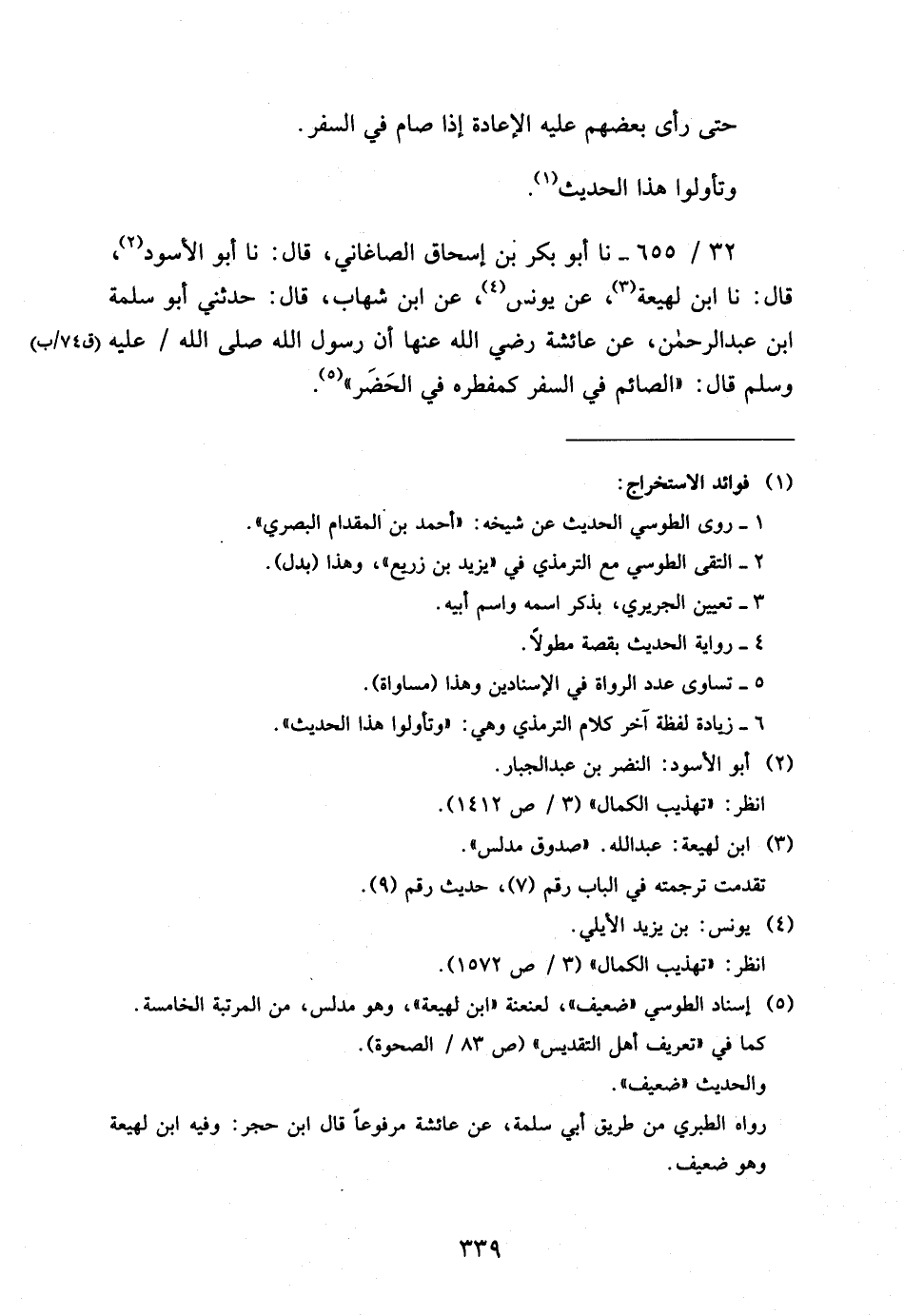 32 - / 655 نَا أَبُو بَكْرِ بْنُ إِسْحَاقَ الصَّاغَانِيُّ قَالَ نَا أَبُو الأَسْوَدِ قَالَ نَا ابْنُ لَهِيعَةَ عَنْ يُونُسَ عَنِ ابْنِ شِهَابٍ قَالَ حَدَّثَنِي أَبُو سَلَمَةَ ابْن عَبْدِ الرَّحْمَنِ عَنْ عَائِشَةَ رَضِيَ اللَّهُ عَنْهَا أَنَّ رَسُولَ اللَّهِ صَلَّى اللَّهُ عَلَيْهِ وَسَلَّمَ قَالَ الصَّائِمُ فِي السَّفَرِ كَمُفْطِرِهِ فِي الْحَضَرِ