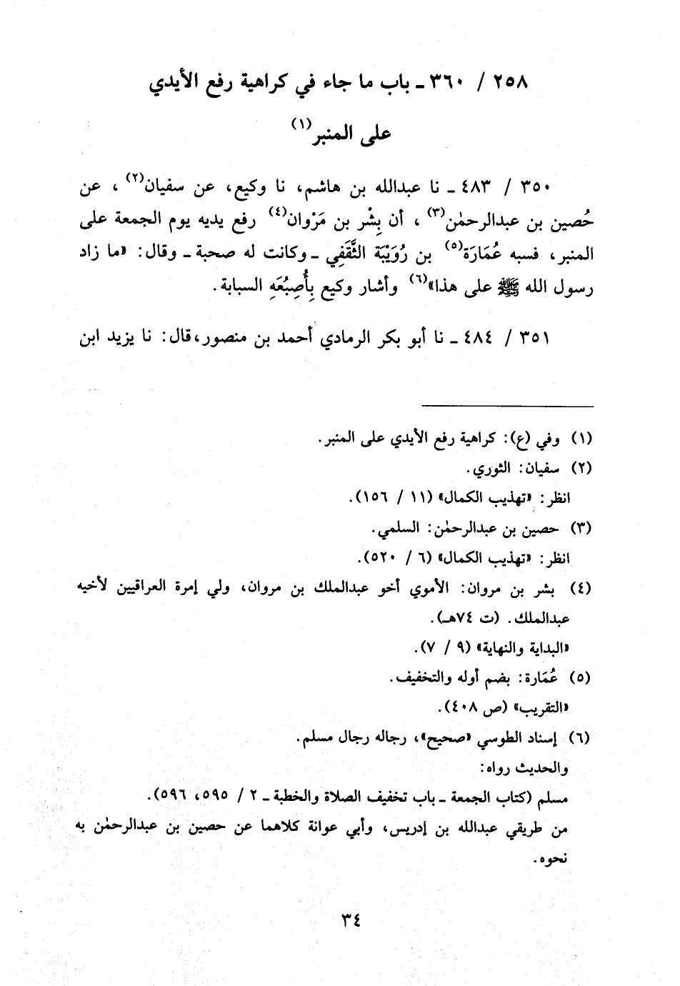 350 - / 483 نَا عَبْدُ اللَّهِ بْنُ هَاشِمٍ نَا وَكِيعٌ عَنْ سُفْيَانَ عَنْ حُصَيْنِ بْنِ عَبْدِ الرَّحْمَنِ أَنَّ بِشْرَ بْنَ مَرْوَانَ رَفَعَ يَدَيْهِ يَوْمَ الْجُمُعَةِ عَلَى الْمِنْبَرِ فَسَبَّهُ عُمَارَةُ بْنُ رُوَيْبَةَ الثَّقَفِيُّ وَكَانَتْ لَهُ صُحْبَةٌ وَقَالَ مَا زَادَ رَسُولُ اللَّهِ صَلَّى اللَّهُ عَلَيْهِ وَسَلَّمَ عَلَى هَذَا وَأَشَارَ وَكِيعٍ بِأُصْبُعِهِ السَّبَّابَةِ