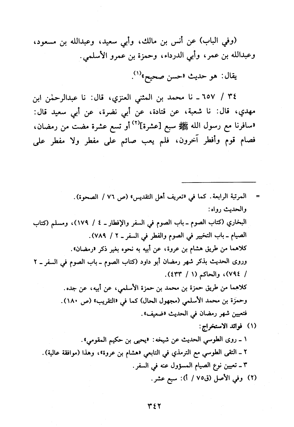 34 - / 657 نَا مُحَمَّدُ بْنُ الْمُثَنَّى الْعَنَزِيُّ قَالَ نَا عَبْدُ الرَّحْمَن ابْن مَهْدِيٍّ قَالَ نَا شُعْبَةُ عَنْ قَتَادَةَ عَنْ أَبِي نَضْرَةَ عَنْ أَبِي سَعِيدٍ قَالَ سَافَرْنَا مَعَ رَسُولِ اللَّهِ صَلَّى اللَّهُ عَلَيْهِ وَسَلَّمَ سَبْعَ عَشْرَةَ أَوْ تِسْعَ عَشْرَةَ مَضَتْ مِنْ رَمَضَانَ فَصَامَ قَوْمٌ وَأَفْطَرَ آخَرُونَ فَلَمْ يَعِبْ صَائِمٌ عَلَى مُفْطِرٍ وَلا مُفْطِرٌ عَلَى