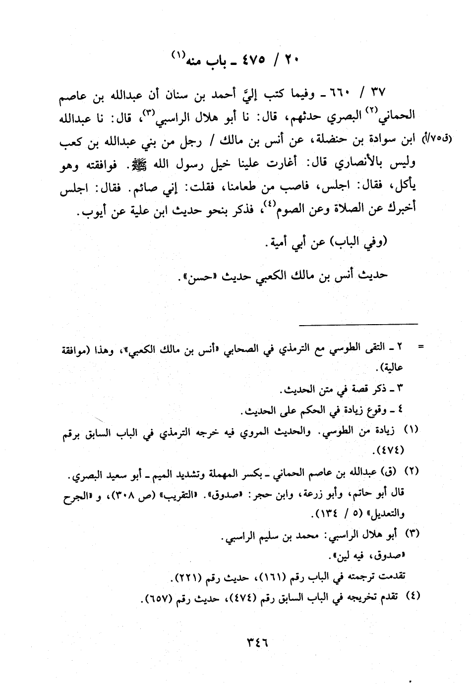 37 - / 660 وَفِيمَا كَتَبَ إِلَيَّ أَحْمَدُ بْنُ سِنَانٍ أَنَّ عَبْدَ اللَّهِ بْنَ عَاصِمٍ الْحِمَّانِيَّ الْبَصْرِيَّ حَدَّثَهُمْ قَالَ نَا أَبُو هِلالٍ الرَّاسِبِيُّ قَالَ نَا عبد الله ابْن سوَادَة بن حنضلة عَنْ أَنَسِ بْنِ مَالِكٍ رَجُلٍ مِنْ بَنِي عَبْدِ اللَّهِ بْنِ كَعْبٍ وَلَيْسَ بِالأَنْصَارِيِّ قَالَ أَغَارَتْ عَلَيْنَا خَيْلُ رَسُولِ اللَّهِ صَلَّى اللَّهُ عَلَيْهِ وَسَلَّمَ فَوَافَقْتُهُ وَهُوَ يَأْكُلُ فَقَالَ اجْلِسْ فَأَصِبْ مِنْ طَعَامِنَا فَقُلْتُ إِنِّي صَائِمٌ فَقَالَ اجْلِسْ أُخْبِرْكَ عَنِ الصَّلاةِ وَعَنِ الصَّوْمِ فَذَكَرَ بِنَحْوِ حَدِيثِ ابْنِ عُلَيَّةَ عَنْ أَيُّوبَ