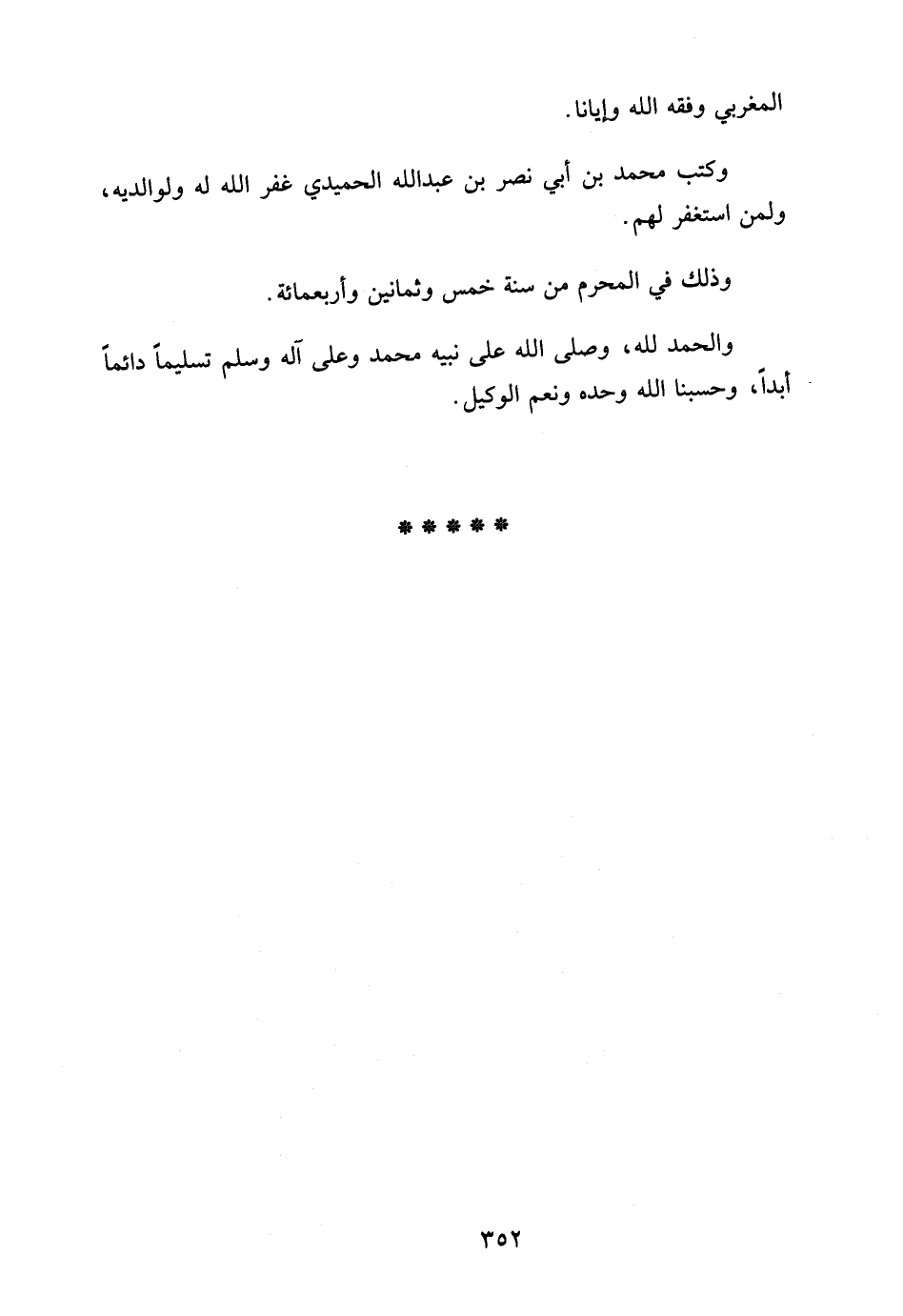 وَكَتَبَ مُحَمَّدُ بْنُ أَبِي نَصْرِ بْنِ عَبْدِ اللَّهِ الْحُمَيْدِيُّ غَفَرَ اللَّهُ لَهُ وَلِوَالِدَيْهِ وَلِمَنِ اسْتَغَفَرَ لَهُمْ