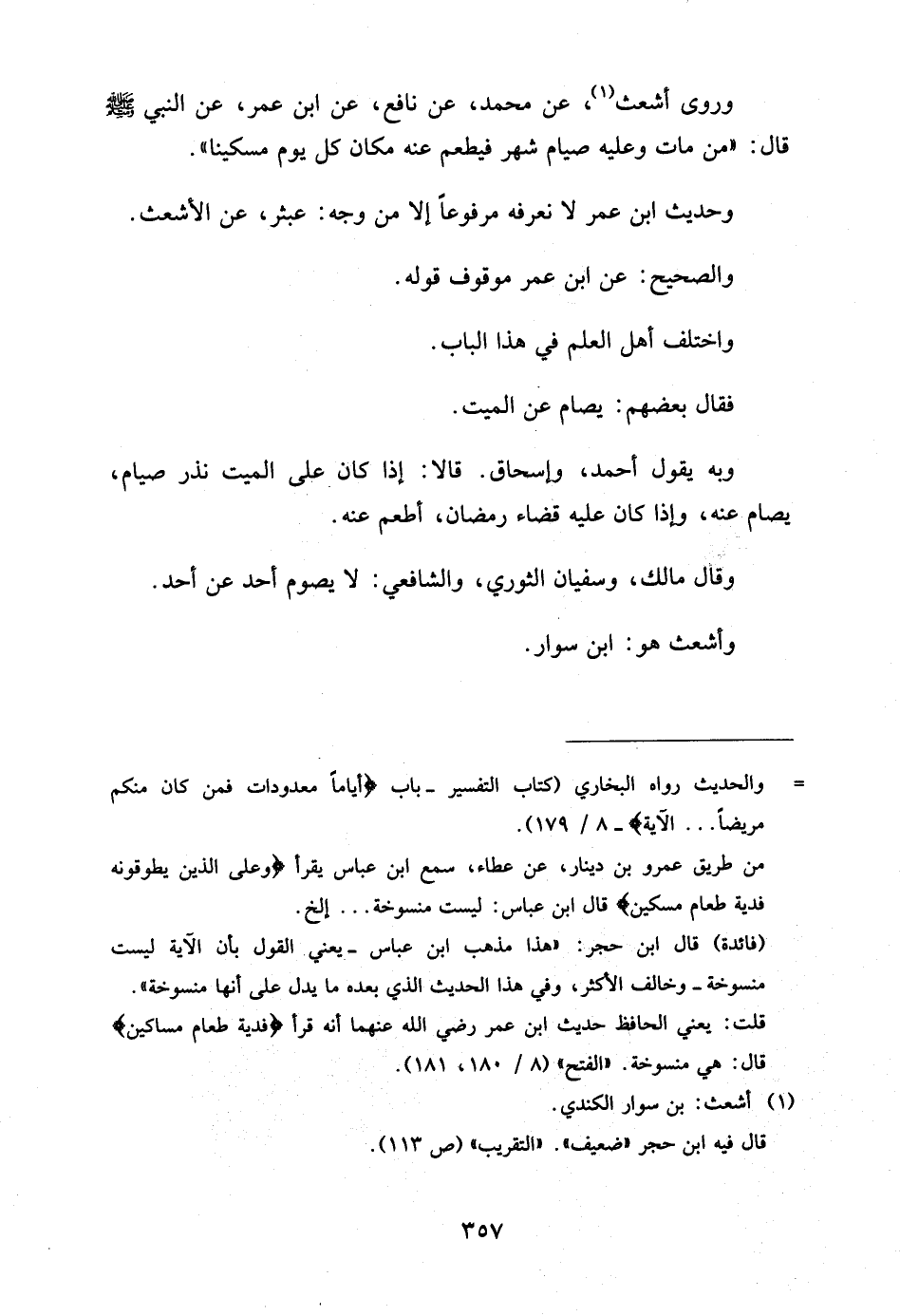 وَرَوَى أَشْعَثُ عَنْ مُحَمَّدٍ عَنْ نَافِعٍ عَنِ ابْنِ عُمَرَ عَنِ النَّبِيِّ صَلَّى اللَّهُ عَلَيْهِ وَسَلَّمَ قَالَ مَنْ مَاتَ وَعَلَيْهِ صِيَامُ شَهْرٍ فيطعم عَنْهُ مَكَانَ كُلِّ يَوْمٍ مِسْكِينًا