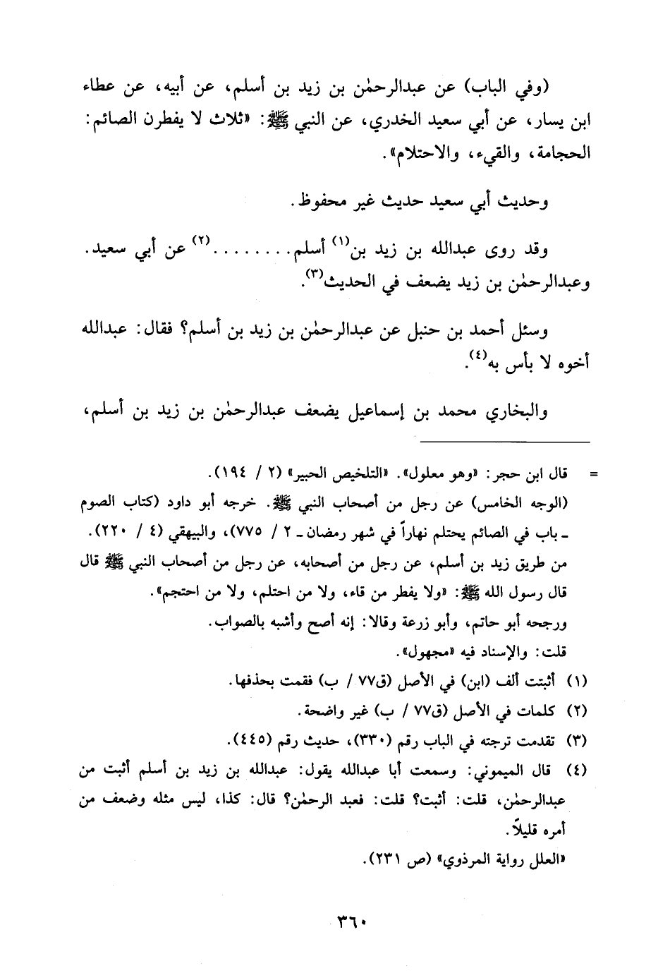وَفِي الْبَابِ عَنْ عَبْدِ الرَّحْمَنِ بْنِ زَيْدِ بن أسلم عَن أَبِيه عَن عَطاء ابْن يَسَارٍ عَنْ أَبِي سَعِيدٍ الْخُدْرِيِّ عَنِ النَّبِيِّ صَلَّى اللَّهُ عَلَيْهِ وَسَلَّمَ ثَلاثٌ لَا يُفَطِّرْنَ الصَّائِمَ الْحِجَامَةُ وَالْقَيْءُ وَالاحْتِلامُ