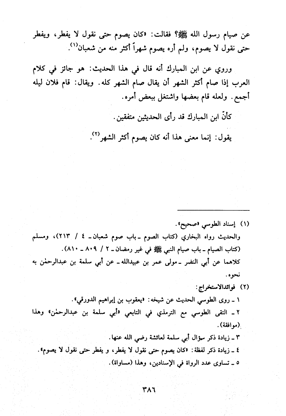 وَرُوِيَ عَنِ ابْنِ الْمُبَارَكِ أَنَّهُ قَالَ فِي هَذَا الْحَدِيثِ هُوَ جَائِزٌ فِي كَلامِ الْعَرَبِ إِذَا صَامَ أَكْثَرَ الشَّهْرِ أَنْ يُقَالَ صَامَ الشَّهْرَ كُلَّهُ وَيُقَالُ قَامَ فُلانٌ لَيْلَهُ أَجْمَعَ وَلَعَلَّهُ قَامَ بَعْضَهَا وَاشْتَغَلَ بِبَعْضِ أَمْرِهِ