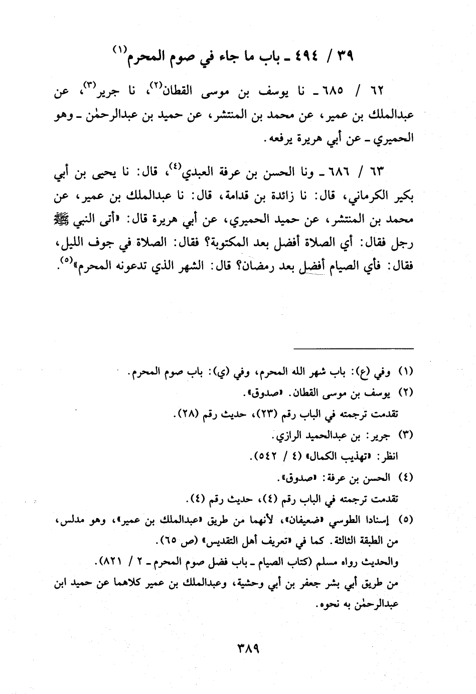 63 - / 686 ونا الْحَسَنُ بْنُ عَرْفَةَ الْعَبْدِيُّ قَالَ نَا يَحْيَى بْنُ أَبِي بُكَيْرٍ الْكَرْمَانِيُّ قَالَ نَا زَائِدَةُ بْنُ قُدَامَةَ قَالَ نَا عَبْدُ الْمَلِكِ بْنُ عُمَيْرٍ عَنْ مُحَمَّدِ بْنِ الْمُنْتَشِرِ عَنْ حُمَيْدٍ الْحِمْيَرِيِّ عَنْ أَبِي هُرَيْرَةَ قَالَ أَتَى النَّبِيَّ صَلَّى اللَّهُ عَلَيْهِ وَسَلَّمَ رَجُلٌ فَقَالَ أَيُّ الصَّلاةِ أَفْضَلُ بَعْدَ الْمَكْتُوبَةِ فَقَالَ الصَّلاةُ فِي جَوْفِ اللَّيْلِ فَقَالَ فَأَيُّ الصِّيَامِ أَفْضَلُ بَعْدَ رَمَضَانَ قَالَ الشَّهْرُ الَّذِي تَدْعُونَهُ الْمُحَرَّمَ
