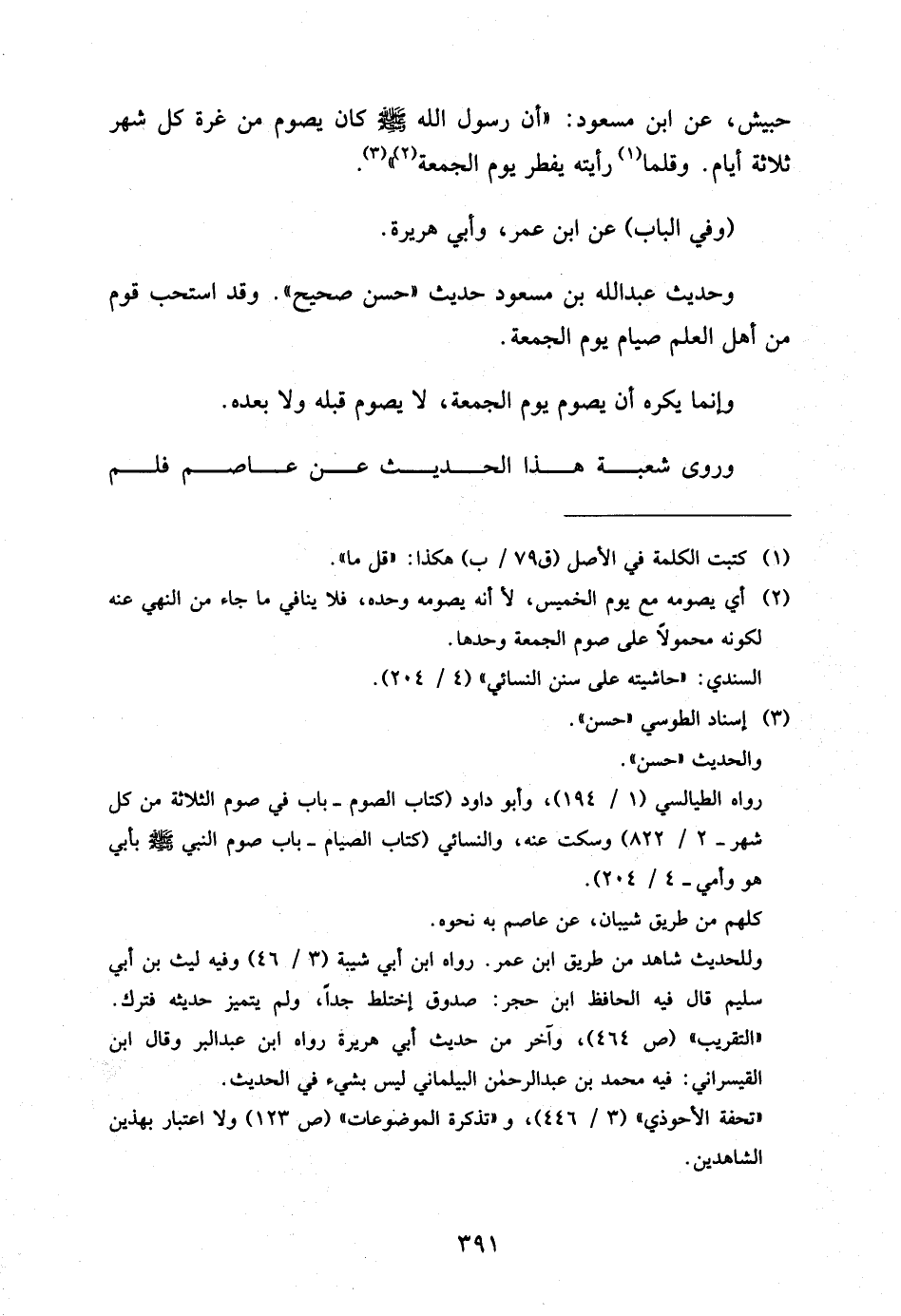 وَحَدِيثُ عَبْدِ اللَّهِ بْنِ مَسْعُودٍ حَدِيثٌ حَسَنٌ صَحِيحٌ وَقَدِ اسْتَحَبَّ قَوْمٌ مِنْ أَهْلِ الْعِلْمِ صِيَامَ يَوْمَ الْجُمُعَةِ