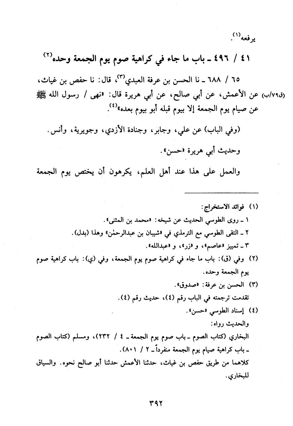 41 - / 496 بَابُ مَا جَاءَ فِي كَرَاهِيَةِ صَوْمِ يَوْمِ الْجُمُعَةِ وَحْدَهُ