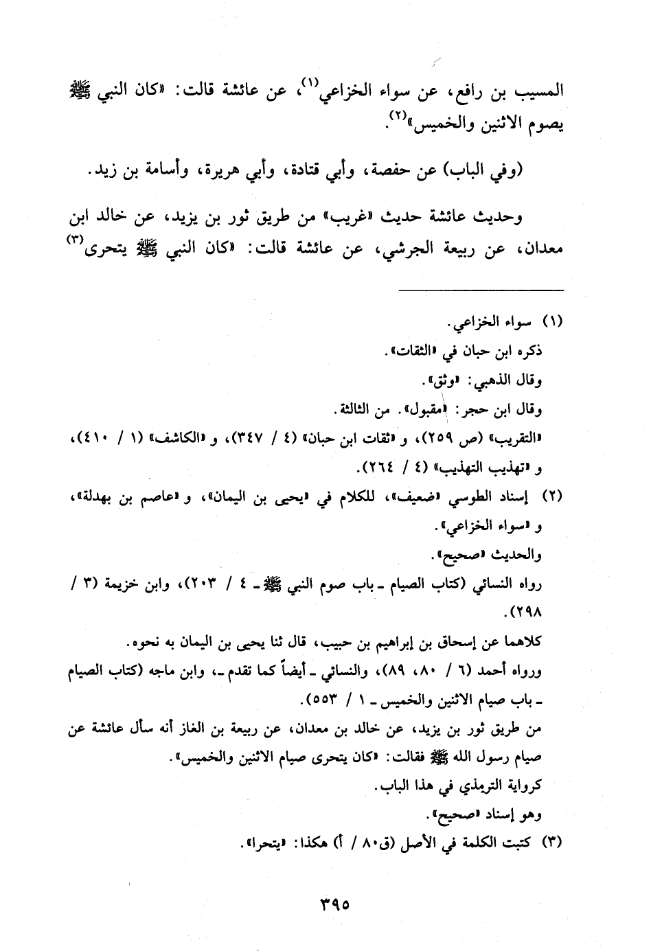 الْمُسَيَّبِ بْنِ رَافِعٍ عَنْ سَوَاءٍ الْخُزَاعِيِّ عَنْ عَائِشَةَ قَالَتْ كَانَ النَّبِيُّ صَلَّى اللَّهُ عَلَيْهِ وَسَلَّمَ يَصُومُ الاثْنَيْنِ وَالْخَمِيسَ