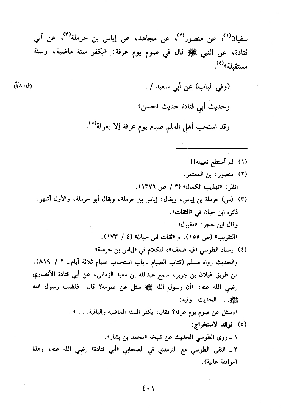 401 - @ سُفْيَانَ عَنْ مَنْصُورٍ عَنْ مُجَاهِدٍ عَنْ إِيَاسِ بْنِ حَرْمَلَةَ عَنْ أَبِي قَتَادَةَ عَنِ النَّبِيَّ صَلَّى اللَّهُ عَلَيْهِ وَسَلَّمَ قَالَ فِي صَوْمِ يَوْمِ عَرَفَةَ يُكَفِّرُ سَنَةً مَاضِيَةً وَسَنَةً مُسْتَقْبَلَةً