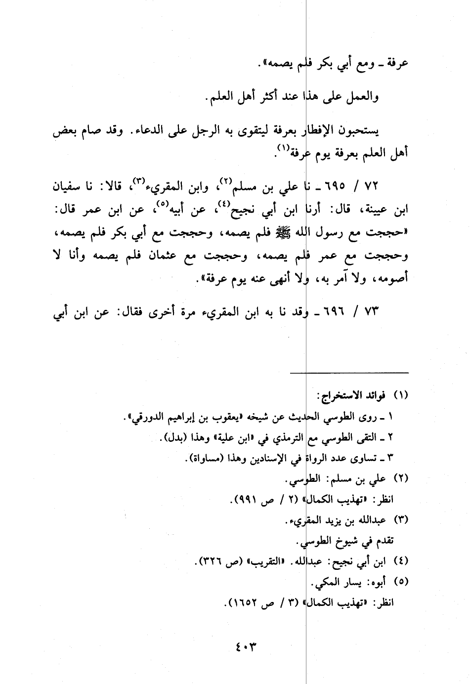 72 - / 695 نَا عَليّ بن مُسلم وَابْن المقريء قَالَا نَا سُفْيَان ابْن عُيَيْنَةَ قَالَ أرنا ابْنُ أَبِي نَجِيحٍ عَنْ أَبِيهِ عَنِ ابْنِ عُمَرَ قَالَ حَجَجْتُ مَعَ رَسُولِ اللَّهِ صَلَّى اللَّهُ عَلَيْهِ وَسَلَّمَ فَلَمْ يَصُمْهُ وَحَجَجْتُ مَعَ أَبِي بَكْرٍ فَلَمْ يَصُمْهُ وَحَجَجْتُ مَعَ عُمَرَ فَلَمْ يَصُمْهُ وَحَجَجْتُ مَعَ عُثْمَانَ فَلَمْ يَصُمْهُ وَأَنَا لَا أَصُومُهُ وَلا آمُرُ بِهِ وَلا أَنْهَى عَنْهُ يَوْمَ عَرَفَةَ