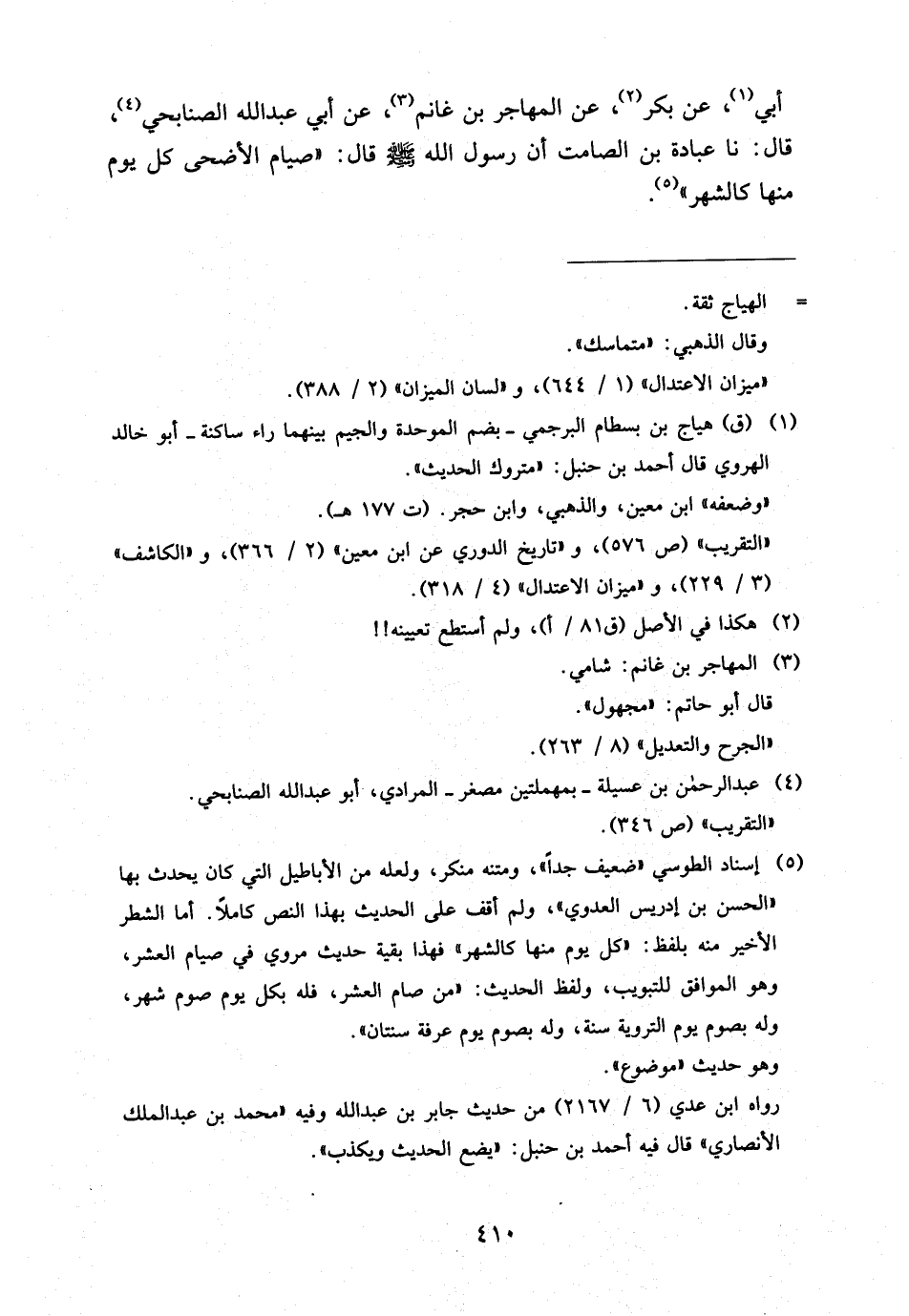أَبِي عَنْ بَكْرٍ عَنِ الْمُهَاجِرِ بْنِ غَانِمٍ عَنْ أَبِي عَبْدِ اللَّهِ الصُّنَابِحِيِّ قَالَ نَا عُبَادَةُ بْنُ الصَّامِتِ أَنَّ رَسُولَ اللَّهِ صَلَّى اللَّهُ عَلَيْهِ وَسَلَّمَ قَالَ صِيَامُ الأَضْحَى كُلَّ يَوْمٍ مِنْهَا كَالشَّهْرِ