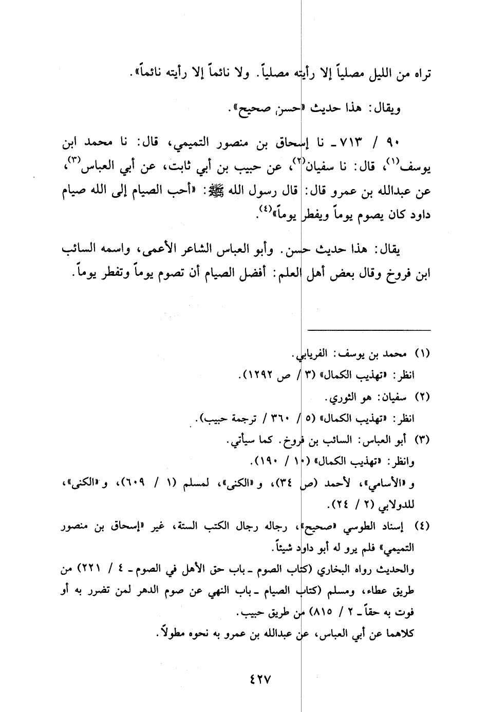 90 - / 713 نَا إِسْحَاقُ بْنُ مَنْصُورٍ التَّمِيمِي قَالَ نَا مُحَمَّد ابْن يُوسُفَ قَالَ نَا سُفْيَانُ عَنْ حَبِيبِ بْنِ أَبِي ثَابِتٍ عَنْ أَبِي الْعَبَّاسِ عَنْ عَبْدِ اللَّهِ بْنِ عَمْرٍو قَالَ قَالَ رَسُولُ اللَّهِ صَلَّى اللَّهُ عَلَيْهِ وَسَلَّمَ أَحَبُّ الصِّيَامِ إِلَى اللَّهِ صِيَامُ دَاوُدَ كَانَ يَصُومُ يَوْمًا وَيُفْطِرُ يَوْمًا