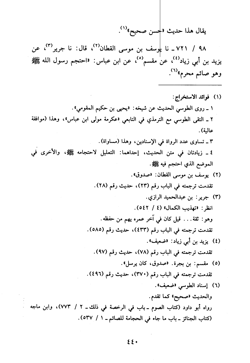 98 - / 721 نَا يُوسُفُ بْنُ مُوسَى الْقَطَّانُ قَالَ نَا جَرِيرٌ عَنْ يَزِيدَ بْنِ أَبِي زِيَادٍ عَنْ مِقْسَمٍ عَنِ ابْنِ عَبَّاسٍ احْتَجَمَ رَسُولُ اللَّهِ صَلَّى اللَّهُ عَلَيْهِ وَسَلَّمَ وَهُوَ صَائِمٌ مُحْرِمٌ