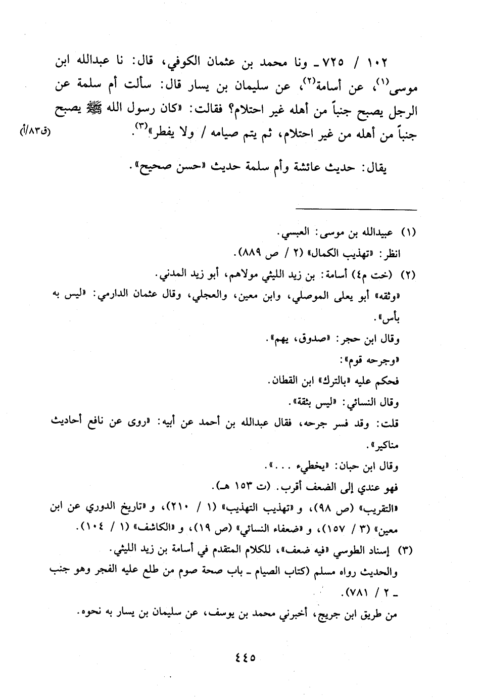 102 - / 725 ونا مُحَمَّدُ بْنُ عُثْمَانَ الْكُوفِيُّ قَالَ نَا عبد الله ابْن مُوسَى عَنْ أُسَامَةَ عَنْ سُلَيْمَانَ بْنِ يَسَارٍ قَالَ سَأَلْتُ أُمَّ سَلَمَةَ عَنِ الرَّجُلِ يُصْبِحُ جُنُبًا مِنْ أَهْلِهِ غَيْرَ احْتَلامٍ فَقَالَتْ كَانَ رَسُولُ اللَّهِ صَلَّى اللَّهُ عَلَيْهِ وَسَلَّمَ يُصْبِحُ جُنُبًا مِنْ أَهْلِهِ مِنْ غَيْرِ احْتِلامٍ ثُمَّ يُتِمُّ صِيَامَهُ وَلا يُفْطِرُ