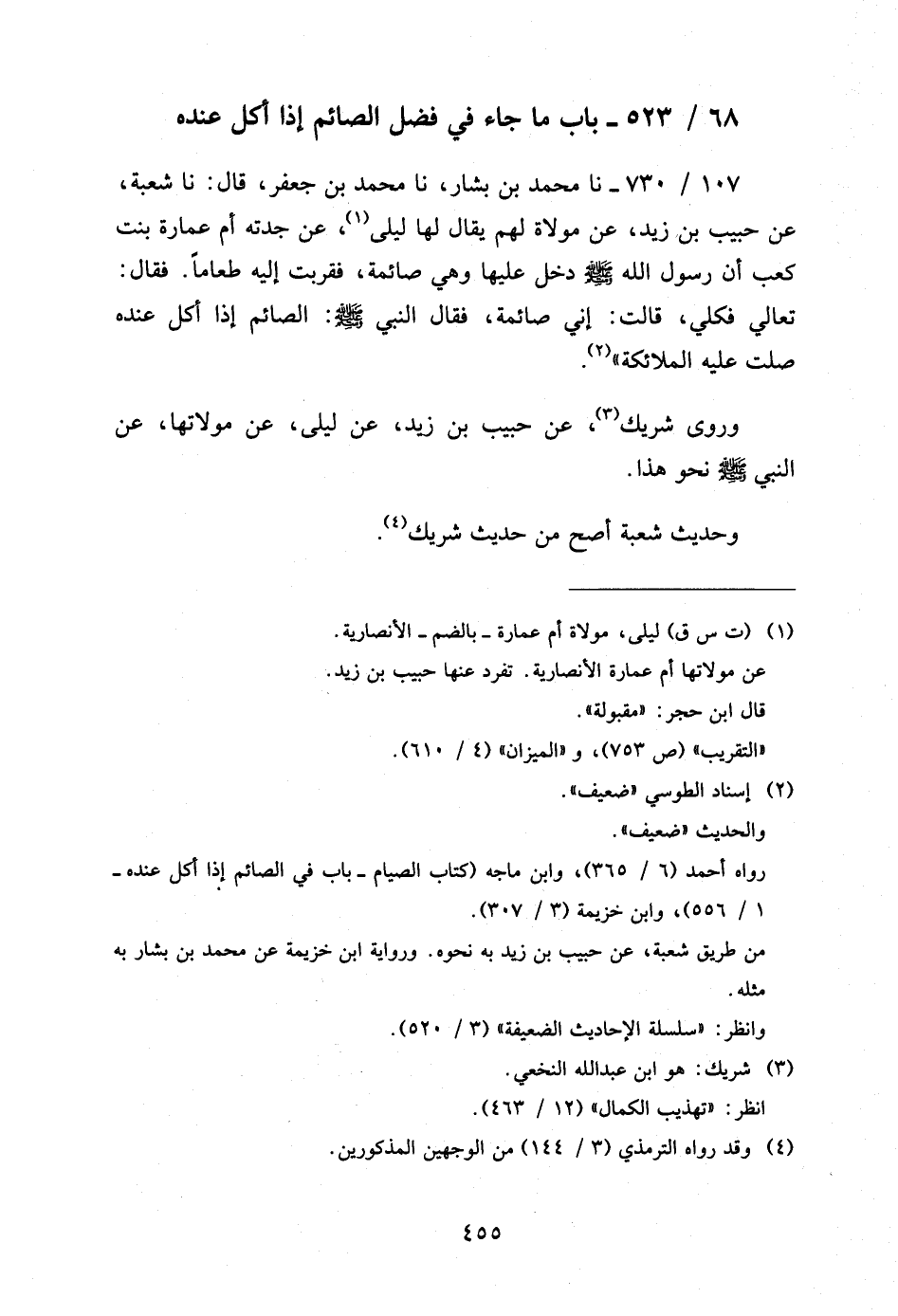 107 - / 730 نَا مُحَمَّدُ بْنُ بَشَّارٍ نَا مُحَمَّدُ بْنُ جَعْفَرٍ قَالَ نَا شُعْبَةُ عَنْ حَبِيبِ بْنِ زَيْدٍ عَنْ مَوْلاةٍ لَهُمْ يُقَالُ لَهَا لَيْلَى عَنْ جَدَّتِهِ أُمِّ عُمَارَةَ بِنْتِ كَعْبٍ أَنَّ رَسُولَ اللَّهِ صَلَّى اللَّهُ عَلَيْهِ وَسَلَّمَ دَخَلَ عَلَيْهَا وَهِيَ صَائِمَةٌ فَقَرَّبَتْ إِلَيْهِ طَعَامًا فَقَالَ تَعَاليْ فَكُلِي قَالَتْ إِنِّي صَائِمَةٌ فَقَالَ النَّبِيُّ صَلَّى اللَّهُ عَلَيْهِ وَسَلَّمَ الصَّائِمُ إِذَا أُكِلَ عِنْدَهُ صَلَّتْ عَلَيْهِ الْمَلائِكَةُ