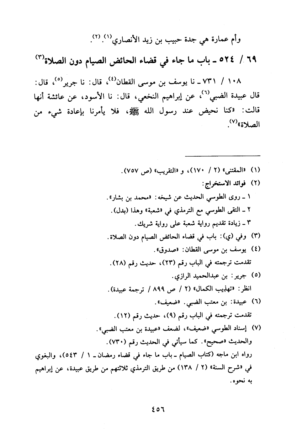 108 - / 731 نَا يُوسُفُ بْنُ مُوسَى الْقَطَّانُ قَالَ نَا جَرِيرٌ قَالَ قَالَ عُبَيْدَةُ الضَّبِّيُّ عَنْ إِبْرَاهِيمَ النَّخْعِيِّ قَالَ نَا الأَسْوَدُ عَنْ عَائِشَةَ أَنَّهَا قَالَتْ كُنَّا نَحِيضُ عِنْدَ رَسُولِ اللَّهِ صَلَّى اللَّهُ عَلَيْهِ وَسَلَّمَ فَلا يَأْمُرنَا بِإِعَادَة شَيْء من الصَّلَاة
