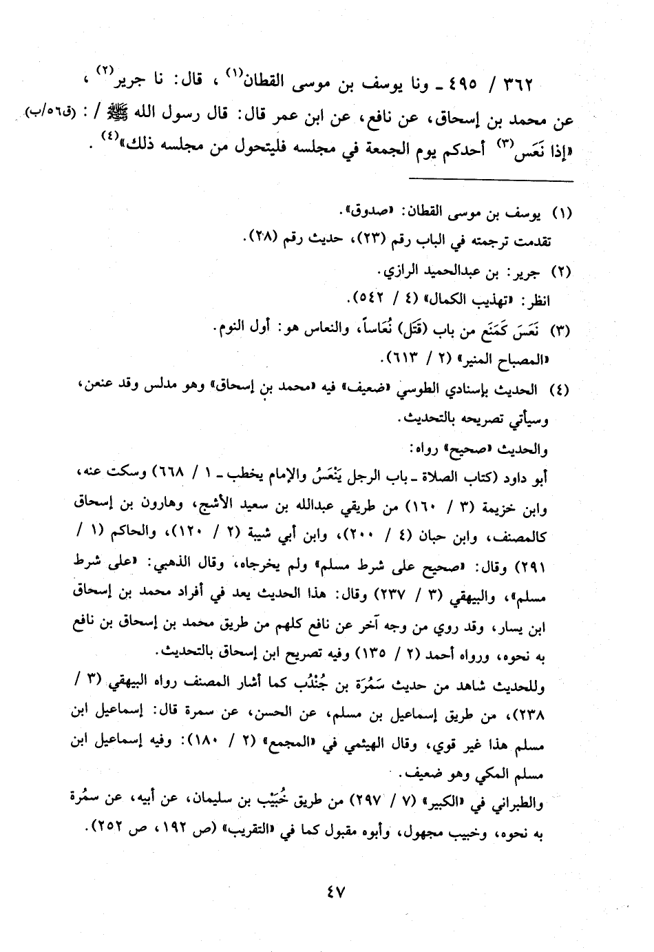 362 - / 495 وَنا يُوسُفُ بْنُ مُوسَى الْقَطَّانُ قَالَ نَا جَرِيرٌ عَنْ مُحَمَّدِ بْنِ إِسْحَاقَ عَنْ نَافِعٍ عَنِ ابْنِ عُمَرَ قَالَ قَالَ رَسُولُ اللَّهِ صَلَّى اللَّهُ عَلَيْهِ وَسَلَّمَ إِذَا نَعَسَ أَحَدُكُمْ يَوْمَ الْجُمُعَةِ فِي مَجْلِسِهِ فَلْيَتَحَوَّلْ مِنْ مَجْلِسِهِ ذَلِك