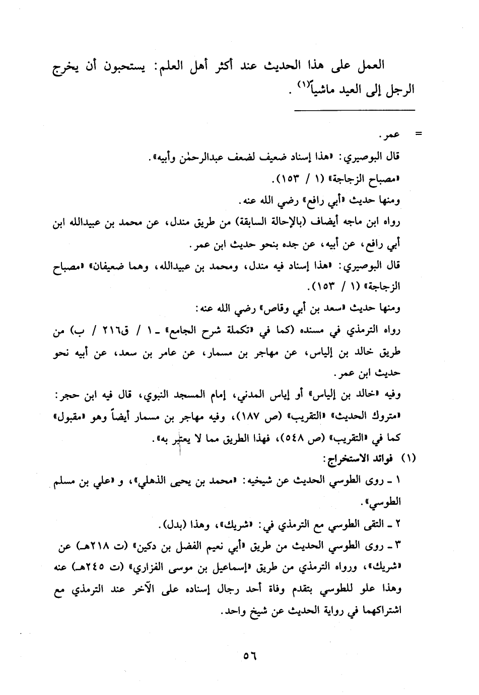 الْعَمَلُ عَلَى هَذَا الْحَدِيثِ عِنْدَ أَكْثَرِ أَهْلِ الْعِلْمِ يَسْتَحِّبُونَ أَنْ يَخْرُجَ الرُّجُلُ إِلَى الْعِيدِ مَاشِيا