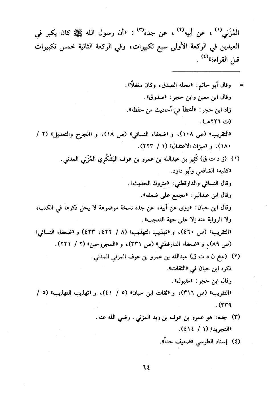الْمُزَنِيُّ عَنْ أَبِيهِ عَنْ جَدِّهِ أَنَّ رَسُولَ اللَّهِ صَلَّى اللَّهُ عَلَيْهِ وَسَلَّمَ كَانَ يكبر فِي الْعِيدَيْنِ فِي الرَّكْعَة الأولى سَبْعَ تَكْبِيرَاتٍ وَفِي الرَّكْعَة الثَّانِيَة خمس تَكْبِيرَات قبل الْقِرَاءَة